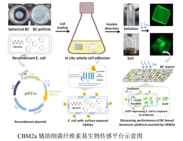 本研究通过引入一种CBM2a辅助增强细胞粘附性设计了一种基于细菌纤维素的生物传感器平台。通过在细胞表面展示可特异性吸附纤维素结晶区的CBM2a,无需任何底物修饰,实现了重组大肠杆菌在BC基质上的高效和特异性固定;并构建L-阿拉伯糖诱导型生物传感器模型,对基于BC的生物传感器平台的生物传感性能进行评价。结果表明,表面展示CBM2a可方便有效增强细胞对BC基质的亲和力,也证明了利用CBM2a作为亲和标签在纤维素生物传感平台设计中的潜力。该研究为利用可持续的纤维素基材料设计环境友好的生物传感平台提供了思路。
