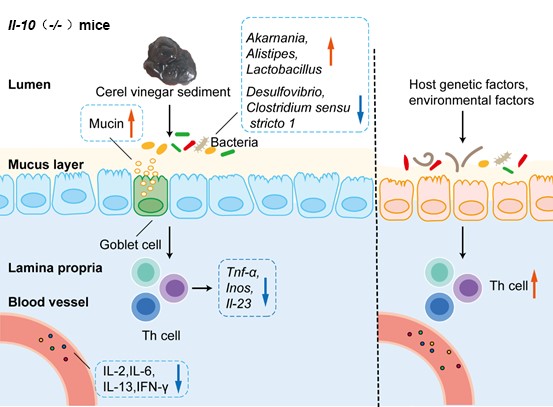 传统食醋在我国有着上千年的历史,多以高粱、大米、糯米等谷物为原料经多种微生物发酵而成,采用传统发酵酿造工艺,经过多道生产工序,可产生独特风味且含丰富的成分的功能食品。谷物醋膏(CVS)是谷物酿造传统食醋在保存过程中产生的沉淀物,富含蛋白、有机酸、多糖,多酚和黄酮等物质。该文章研究了 CVS 对 Il-10基因敲除小鼠自发性结肠炎的影响。研究发现 CVS 减轻了结肠炎小鼠肠道上皮损伤,抑制了髓过氧化物酶 (MPO) 活性和丙二醛 (MDA) 水平,降低了结肠组织中炎症因子 Tnf-α、Inos、Il-23 的基因表达。 CVS 还抑制结肠炎小鼠血清中炎症因子 IL-2、IL-6、IL-13、G-CSF、GMCSF、IFN-γ 和 RANTES 的分泌。CVS增强结肠炎小鼠肠道组织抗菌肽Reg3γ表达,促进粘蛋白Muc2、Muc3和Muc4基因表达及Muc-2蛋白表达,并增加肠道内乙酸含量。此外,CVS 通过增加肠道潜在有益菌 Akkermansia、Alistipes 和 Lactobacillus 的丰度,同时抑制潜在有害菌 Desulfovibrio 和 Clostridium sensu stricto 1 来改变肠道微生物群的组成,这些变化或可影响机体类固醇、脂肪酸和胆汁酸的调控。