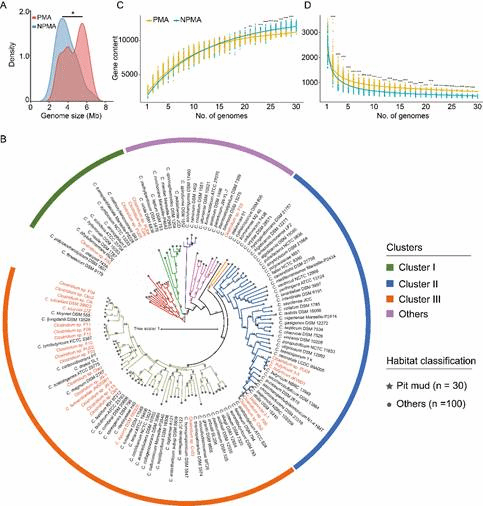 许正宏教授团队联合泸州老窖沈才洪教授级高工团队,对来自不同生境的130株梭菌进行了比较基因组学研究,揭示了窖泥来源和其他来源梭菌菌株基因组水平的功能差异。窖泥菌株中富集了与环境适应相关的途径,编码乙醇脱氢酶和L-乳酸脱氢酶的基因数量也显著高于其他来源菌株,这可能有助于梭菌适应窖池内高乙醇和高乳酸的环境。碳水化合物活性酶在窖泥梭菌中显著富集,可能有利于它们对窖池环境中碳水化合物的利用。在功能上,大多数窖泥梭菌菌株具有代谢乙醇、乳酸和淀粉合成脂肪酸的良好潜力。此外,初步分析了基因水平转移在梭菌适应窖池环境中的作用。研究结果揭示了窖泥中梭菌的环境适应性和代谢特征的遗传基础,从生物适应性的角度解读了“老窖出好酒”的科学内涵,也为阐明窖泥微生态系统的形成机制提供了新见解。