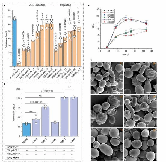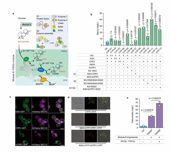 为此,本研究在酿酒酵母中重构甜茶苷代谢合成途径。首先,基于合成生物学中的代谢网络模块化方法将甜茶苷合成途径分为5个模块,包括萜类合成模块、P450s模块、甜茶苷合成模块、UDP-葡萄糖合成模块和甜茶苷转运模块。通过优化萜类合成模块,并引入P450s模块和甜茶苷合成模块,成功获得甜茶苷产量为4.5 mg/L的生产底盘(图1)。其次,通过改造P450酶、构建人工底物代谢通道、扩大内质网等策略解除P450s模块中的限速步骤,甜茶苷产量提高至67.7 mg/L(图2)。随后,结合蛋白质结构预测、分子对接等技术开发了一种针对甜茶苷转运模块外排泵筛选的快捷方法。通过外排泵抑制实验判定甜茶苷外排泵属于ABC外排泵家族;经实验验证PDR11为酿酒酵母中甜茶苷的外排泵;强化甜茶苷转运模块后,产量提高至155.6 mg/L;同时,本研究通过强化MSN4表达提高工程菌株对甜茶苷的适应性后,甜茶苷的产量达到205.5 mg/L(图3)。最后,针对甜茶苷合成途径构建了基因组规模代谢网络模型,并应用OptKnock算法预测甜茶苷生产底盘中的基因敲除靶点,发现UDP-葡萄糖供给不足是限制甜茶苷高效合成的一个关键因素,通过UDP-葡萄糖合成模块进行优化与代谢流再分配后,甜茶苷在摇瓶中的产量达到302.1 mg/L,经15-L发酵罐放大培养后,甜茶苷产量达到1368.6 mg/L(图4)。