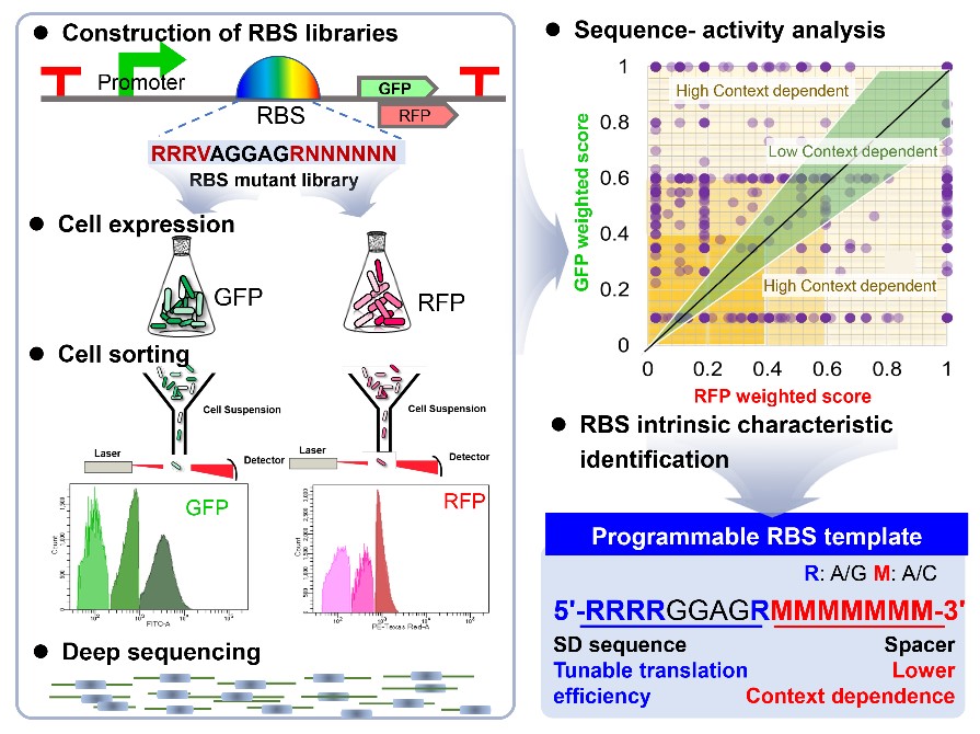 团队围绕RBS的正交性差,即其强度受到基因背景干扰严重的问题,开发了大规模元件突变文库-FlowSeq技术采集表型和基因型相关参数高通量采集-多基因背景的交叉分析研究技术方法,阐明了RBS的序列特征和与翻译效率和背景依赖性之间的关联,总结了降低背景依赖性、具有强度可编辑能力的RBS的通用设计模板。建立了基于one-class SVM的RBS背景依赖性预测模型。研究得到的结果为“即插即用”的RBS调控元件开发提供了实用工具。
