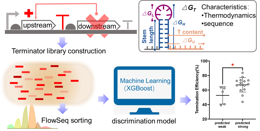 在终止子的研究中,团队主要围绕终止子序列热力学特征解析,以及终止子分别对上下游基因表达强度的调控作用分析开展研究。通过序列-活性分析阐明了终止子的序列特征、结构特征以及表达强度之间的关联,首次发现了强终止子不仅可以及时有效的下游基因转录,同时对上游基因的表达具有积极意义。研究建立了基于XGBoost算法的终止子强度的判别模型,并通过合成终止子序列进行了验证。研究得到的结果为理性开发高性能终止子提供了基础参数。