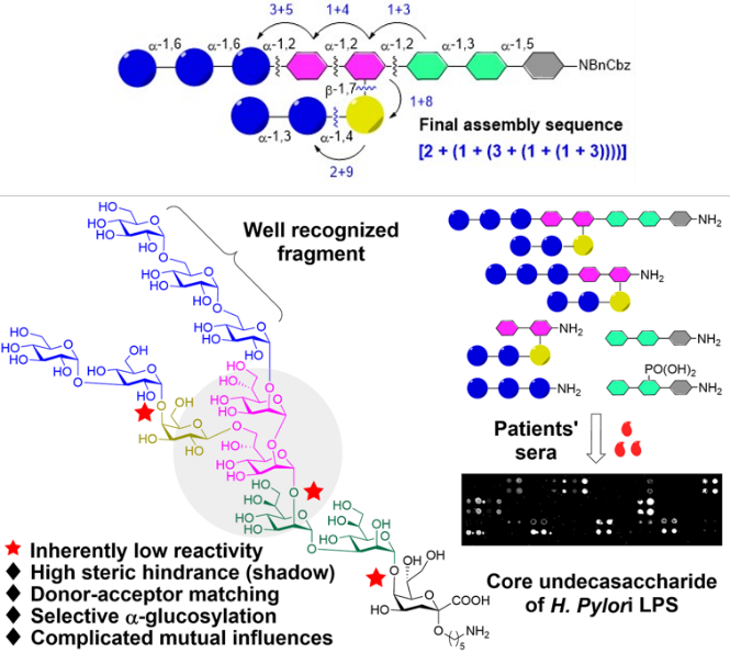 尹健教授团队一直致力于通过化学合成驱动糖疫苗的研究与创制,已完成多种重要致病菌糖链抗原的合成及免疫活性研究(J. Am. Chem. Soc., 2018, 140, 3120;Chem. Eur. J., 2018, 24, 2868;Chem. Commun., 2020, 56, 344;Front. Chem., 2020, 8, 258;Angew. Chem. Int. Ed., 2020, 59, 13362;Angew. Chem. Int. Ed., 2020, 59, 20529),尤其在幽门螺旋杆菌糖链抗原的合成及活性研究中,取得了一系列重要进展,先后完成幽门螺旋杆菌外核心八糖、O2血清型O-抗原六糖、O6血清型O-抗原十三糖的化学合成及抗原性研究(Chem. Eur. J., 2018, 24, 2868;Chem. Commun., 2020, 56, 344;Angew. Chem. Int. Ed., 2020, 59, 13362)。在此基础上,以幽门螺旋杆菌脂多糖的高立体位阻核心十一糖作为目标分子开展化学合成研究。通过优选的正交保护策略,解决了糖基供体与受体活性匹配的问题;结合酰基远程参与效应和溶剂效应,实现了结构中a-葡萄糖苷键的高立体选择性构建;经多次组装序列优化,克服了高碳糖和支链结构的高立体位阻,采用线性[2 + (1 + (3 + (1 + (1 + 3))))]合成策略,实现了幽门螺旋杆菌脂多糖核心十一糖的首次全合成,为其他高空间位阻复杂糖链的合成提供了有价值的参考。在此基础上,该课题组合成了磷酸化内核心三糖、a-1,6-葡萄三糖等糖链片段,利用糖芯片技术开展了糖链抗原性分析。发现a-1,6-葡萄三糖与多数幽门螺旋杆菌感染者血清具有较强结合作用,是核心十一糖的重要抗原表位;磷酸化内核心三糖与感染者血清结合的数量及强度均明显高于无磷酸的内核心三糖,表明磷酸基团是核心十一糖的重要特异结构。本研究为幽门螺旋杆菌糖结合疫苗的开发提供了重要的理论基础。