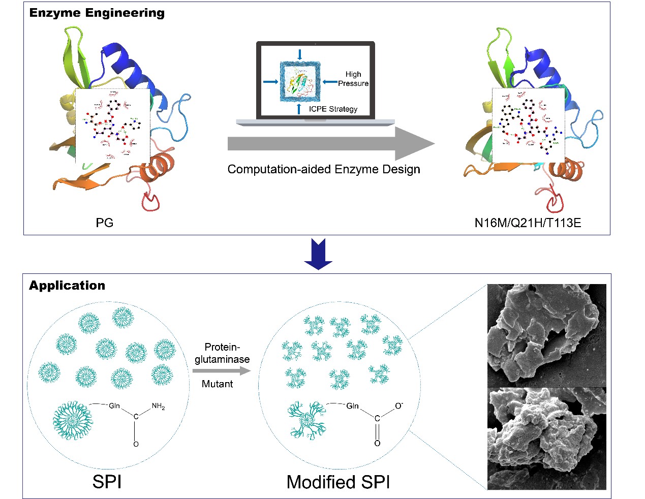 针对上述问题,夏小乐团队开发了一种基于等温压缩系数(βT)微扰工程(ICPE)策略,结合高压分子动力学模拟,理性筛选“高波动”区域,利用算法互补的自由能计算软件(FoldX和I-Mutant 2.0)筛选潜在的有益单点突变体,结合贪婪算法构建组合突变体,从而得到高适应性的蛋白质谷氨酰胺酶。此外,系统地分析了蛋白质谷氨酰胺酶在复杂加工条件下的催化机理,为蛋白质谷氨酰胺酶的应用提供了理论依据,同时该策略也为其他酶的体外重新设计提供了平台。