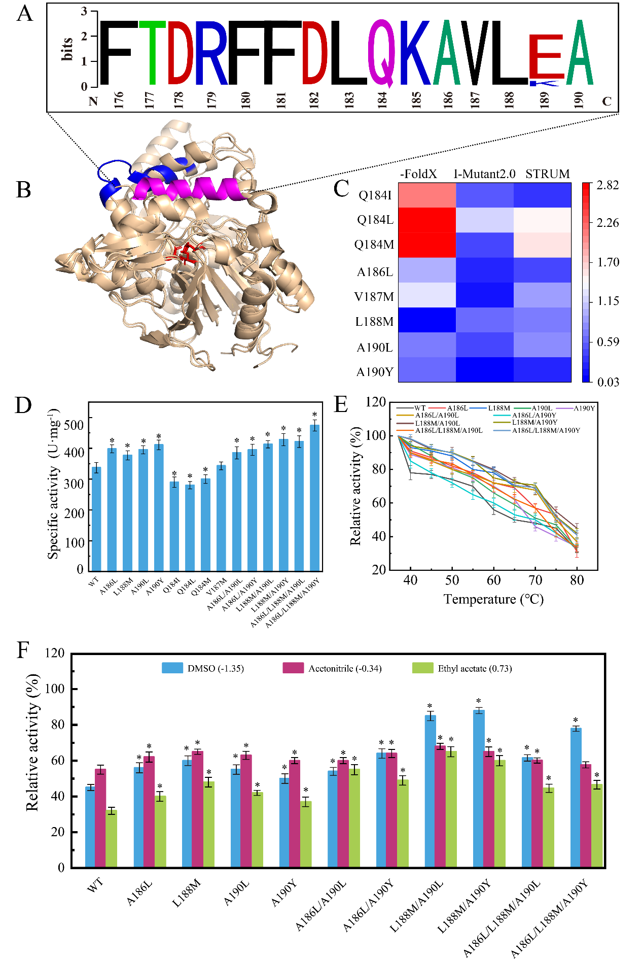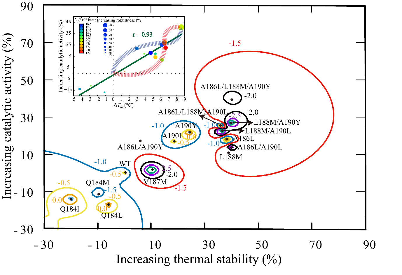 作者以T1脂肪酶作为研究对象,通过等温压缩系数微扰工程策略构建一系列突变体,经系统地分析发现突变体的稳定性与活性呈现强相关性(r=0.93)。最优突变体A186L/L188M/A190Y的Tm值高达78.7°C,比酶活为474.04 U/mg,DMSO耐受性较野生型提高73.33%。由等温压缩系数介导的弹性激活机制解析了稳定性和活性之间的权衡。等温压缩系数微扰工程策略加深了对稳定性-活性权衡的理解,促进了其在酶工程中的应用。