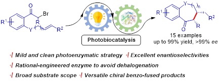近年来,光酶协同催化法在挖掘现有酶的催化新活性方面取得了巨大的进展,开辟了新酶反应开发的新方向。饶义剑教授团队设计开发了一种新颖的对映选择性光酶催化反应实现了一系列手性苯并含氧杂环化合物的不对称合成(图1)。作者首先在建立黄素依赖型烯烃还原酶(‘ene’-reductases)催化合成苯并含氧杂环反应体系的基础上,通过对烯烃还原酶GluER进行半理性的定点突变,显著抑制副反应的同时,以优异的产率和对映选择性获得多种手性苯并氧杂䓬酮、色满酮和茚酮类化合物,显示了良好的官能团耐受性。作者最后根据控制实验和分子对接的结果,提出了该反应的反应机理并解释了反应立体选择性的来源。本研究进一步扩展了光酶协同催化的反应类型,为构建复杂多环结构骨架提供绿色合成途径,为开发新的生物催化反应提供新的思路。