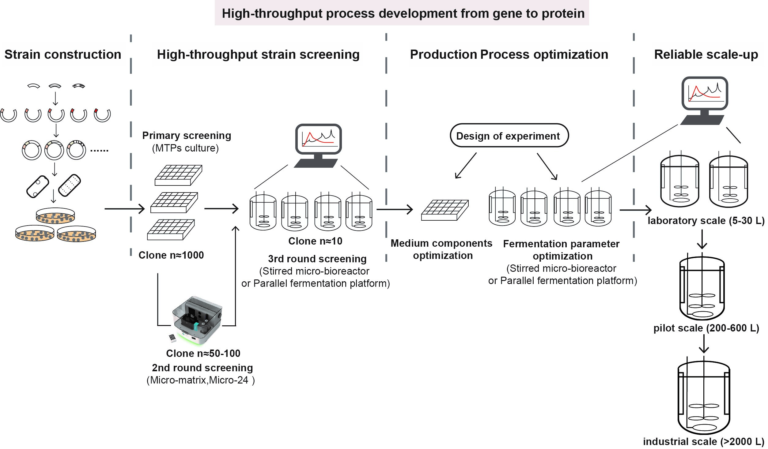 这篇综述提出了一个系统的、整体的、从基因克隆到蛋白质生产的高通量工艺开发方案。作者详细讨论了关键步骤,包括基因构建、蛋白表达分析、生产菌株筛选、培养基优化、发酵工艺开发和可靠放大等。在构建表达菌株阶段,作者提倡使用高通量克隆构建技术结合表达元件组合策略,生成大量的克隆,以建立最佳的候选菌株。在蛋白表达分析和生产菌株筛选阶段,作者强调了高通量培养检测平台的应用以及多轮发酵筛选的必要性。在培养基优化、发酵工艺开发和放大阶段,文章强调了高通量平行发酵系统、自动化控制系统以及数据管理分析共享系统的重要性,同时还提及了使用可靠的发酵工艺放大策略的必要性。最后文章还对先前研究中存在的问题进行了深入分析,包括高通量技术的系统性整合不足、生产工艺放大的难题,以及由于高通量平台的发展带来的工艺开发策略需要调整等问题。