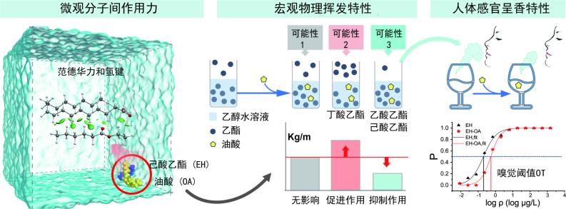 白酒含有种类丰富的风味化合物,它们的高维互作效应对解析白酒风味物质“结构-品质”之间关系带来了极大的挑战。白酒中普遍存在长链脂肪酸(LCFAs),由于这类物质挥发性较弱,呈香呈味作用小,长期以来没有得到风味化学家的足够重视。研究团队从微观的分子间互作、宏观理化性质、人体感知特性三个层面,确证了长链脂肪酸类对白酒香气特征的影响,并基于分子互作关系系统解析了其对风味物质呈香特性的影响机制。