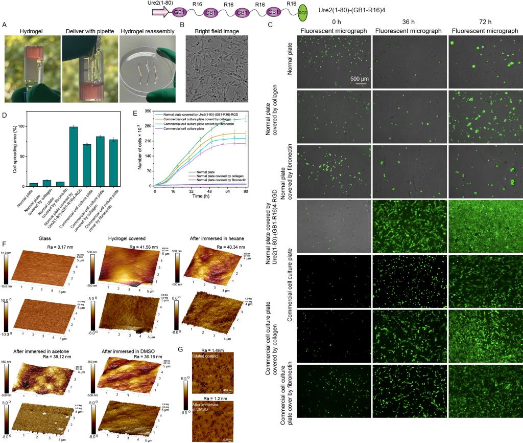图1 超分子弹性蛋白遇水即粘,在1%浓度时即可形成可注射式超分子水凝胶,水凝胶在水下依旧具有粘附性。本论文的水凝胶形成无需任何额外预处理手段,只需要将蛋白溶解静置即可获得,可以最大程度保持蛋白活性