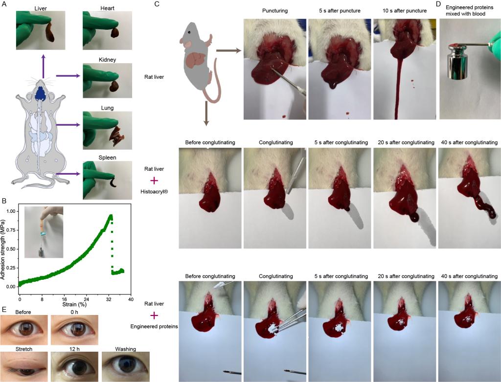 图2 超分子弹性蛋白可作为强效、快速生物止血剂。A: 1 mg的超分子弹性蛋白可以轻松粘附起大鼠的各个器官;B: 10 mg的弹性蛋白可以粘附猪皮,强度约为1 MPa;C: 超分子弹性蛋白具有快速止血功能,仅10 mg蛋白即可完全止血大鼠肝脏;D: 10 mg的超分子弹性蛋白遇血后可粘附起500g的砝码;E: 超分子弹性蛋白可以作为双眼皮贴