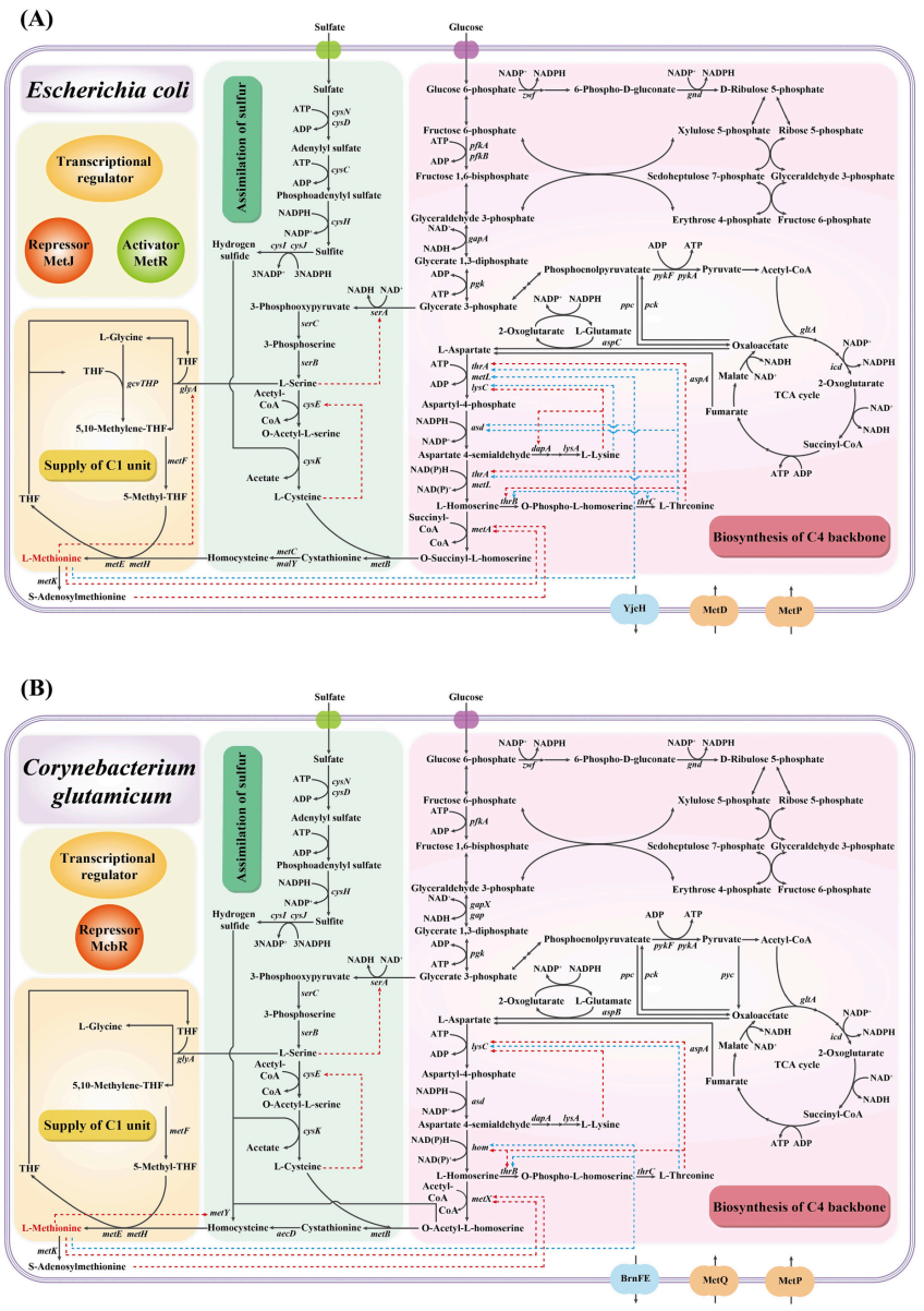 L-甲硫氨酸是一种必需氨基酸,广泛应用于食品、饲料、化妆品和医药等行业。近年来,随着代谢工程和合成生物学的快速发展,大多数氨基酸的工业化生产都可以通过微生物发酵法实现,然而,L-甲硫氨酸因其复杂的生物合成途径和严格的调控机制,目前实现它的微生物高效生产还面临着巨大的挑战。此外,利用微生物法生产L-甲硫氨酸的前体物质L-高丝氨酸、O-琥珀酰-L-高丝氨酸和O-乙酰-L-高丝氨酸的研究也受到广泛关注,因为它们可以通过体外高效的酶促反应生成L-甲硫氨酸,这也是一种非常具有前景的L-甲硫氨酸生产方法。