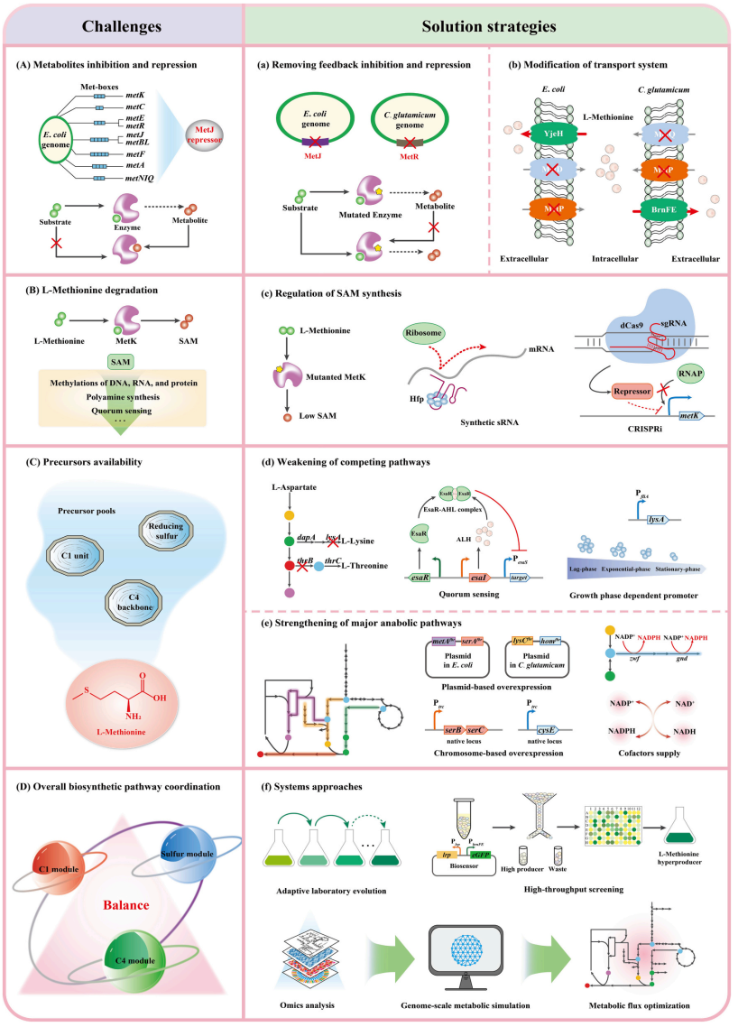 图3 微生物生产L-甲硫氨酸存在的挑战和可能的解决策略