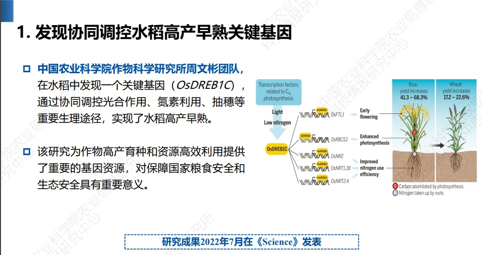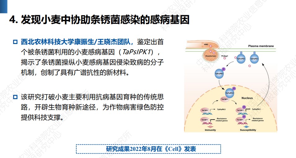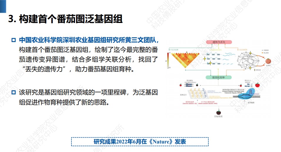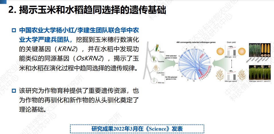 2023年12月6日召开的中国农业农村科技发展论坛发布了《2023中国农业科学重大进展》。中国农业科学院按照 “前沿引领、开创卓越、重大突破”的原则,以2022年度Web of Science收录的农业领域中国学者为第一或通讯作者发表的2231篇高水平论文为基础,经初选、院士遴选和综合遴选等过程,评选出10项代表2022年我国农业科技前沿研究水平、取得重大突破性进展的基础科学研究成果。