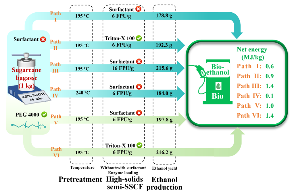 针对以上问题,该团队尝试在预处理和酶水解过程中同时添加表面活性剂。研究发现,在甘油预处理中加入表面活性剂(PEG,Tween,Triton-X)能有效修饰木质素结构,减缓木质素再缩合副反应,从而提高预处理底物的可酶解性;而且减少近20%能量消耗。进一步在底物酶水解过程中添加表面活性剂显著减弱了残留木质素与纤维素酶之间的非生产性吸附,进而促进预处理底物的高效酶解产糖,纤维素酶用量节省一半以上。以纤维素乙醇生产过程进行能量系统评估,此策略可实现1.4 MJ/kg的净能量增益。总之,表面活性剂在纤维质原料酶法水解制糖方面将具有突出作用。