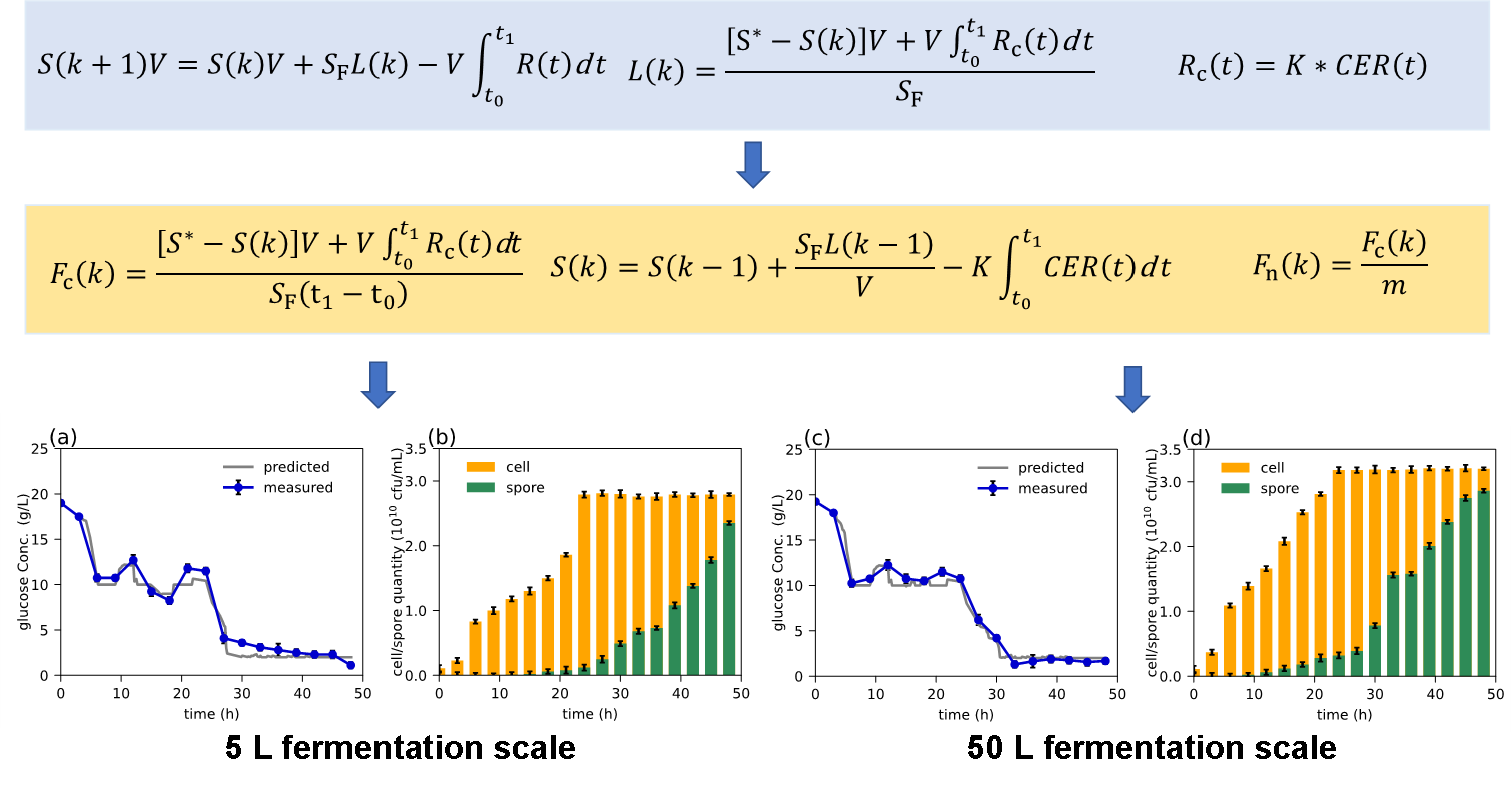 丁健团队以地衣芽孢杆菌BF-002发酵过程为研究对象,初始葡萄糖浓度(10 g/L)和氨基氮浓度(1.5 g/L)可促进细胞生长,随后降低葡萄糖浓度(2.0g/L)和氨基氮浓度(0.5 g/L)以维持孢子的生成。孢子数量达到 2.59 × 1010 cfu/mL。在 5 L和50 L培养罐中开发并实施了自动协同流加策略,结果表明孢子数量分别为 2.35 × 1010 和2.86 × 1010cfu/mL,与固定葡萄糖浓度(10.0 g/L)相比,分别提高了6.81% 和 30.00%。对 5 L和 50 L规模的培养罐经过喷雾干燥处理后,得到细菌的细胞存活率分别为 85.94% 和 82.68%。即使在高温高湿的恶劣条件下,细胞存活率也分别保持在72.80%和 69.89%。采用自动协同流加策略增加了与孢子形成相关基因 spo0A、spoIIGA、bofA 和spoIV 的转录水平,分别提高了 7.42%、8.46%、8.87% 和9.79%。所提出的策略有效地促进了地衣芽孢杆菌的生长和孢子形成,从而提高了地衣芽孢杆菌制剂的质量。