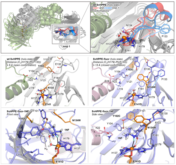 在确认了初始活性后,作者通过定向进化逐步提高了SvHppE的催化性能。鉴于天然底物S-HPP与模型底物N-氟酰胺1NF之间存在较大的结构差异,作者首先构建了SvHppE的同源模型,并对“酶–底物”进行了分子动力学(MD)模拟。再结合隧道分析,作者确定了一些关键的氨基酸残基位点,包括Y101、Y102、A131、N134和F181,这些残基很可能会影响底物1NF在SvHppE中的结合和定位。与中心铁配位的临近氨基酸残基E141同上述五个氨基酸位点,一并作为点饱和突变(SSM)的对象。对E141进行点饱和突变和筛选后发现了E141D优势突变体,其催化活性比野生型明显上升:产率7.1%和对映体比例e.r =/info/1021/ /80:20。以E141D突变体作为母体,在其他五个位点上进行了后续点饱和突变和筛选,得到了一个三重突变体SvHppE_N134W_E141D_Y102C(以下简称:SvHppE-Fluor),能够以TTN =/info/1021/ /50、产率30%和对映比96.5:3.5的催化效率得到目标氟化产物(图3)。