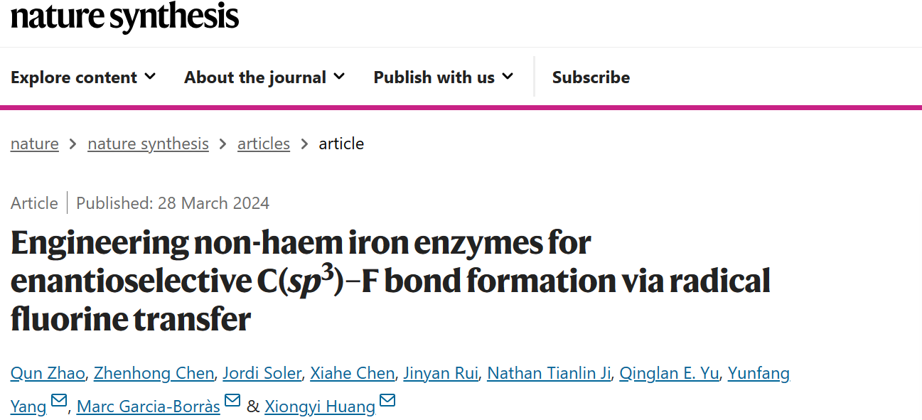 近期,我校beat365在线唯一官网赵群教授和浙江工业大学杨云芳教授、赫罗纳大学Marc Garcia-Borràs教授、约翰霍普金斯大学Xiongyi Huang教授在金属酶催化新功能拓展方面取得重要进展,研究成果“Engineering non-haem iron enzymes for enantioselective C(sp3)–F bond formation via radical fluorine transfer”正式发表于《Nature Synthesis》杂志。