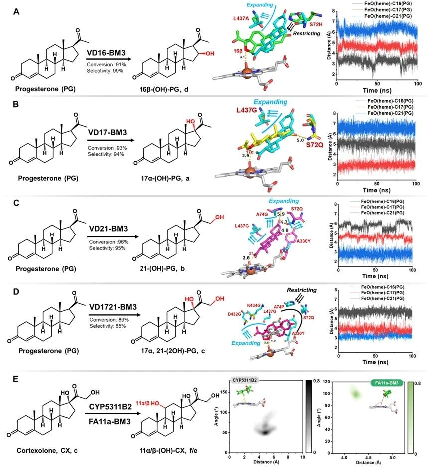 针对上述问题,beat365在线唯一官网食品合成生物学与生物制造团队研究人员基于计算模拟指导改造了P450BM3并用于黄体酮合成皮质酮再合成氢化可的松的两步合成途径中。第一步合成:以野生型P450BM3(Bacillus megaterium来源)出发,逐步通过B-Factor指导的底物通道改造、重塑heme中心口袋和自由能计算指导的heme中心口袋柔性化的三代精细化酶工程,最终获得了VD16-BM3、VD17-BM3、VD21-BM3和VD1721-BM3可以分别高效区域选择性羟化黄体酮的C16β、C17α、C21和C17α/21,值得注意的是VD1721-BM3可以将黄体酮合成皮质酮的步骤简化为一步单酶反应。第二步合成:需要获得高效催化元件羟基化修饰皮质酮的C-11位,首先分别验证了文献报道的CYP5311B2和LG23,其中CYP5311B2可以羟化修饰皮质酮的C-11β,其转化率和区域选择性分别为93%和91%,可以用于后续氢化可的松全细胞合成体系构建。CYP5311B2和LG23催化进程研究发现底物通道是影响P450羟化修饰甾体不同碳位的关键,因此基于底物通道切换策略,理性改造得到了FA11a-BM3可高效催化皮质酮合成11α-氢化可的松,转化率和区域选择性分别为85%和90%。分子动力学模拟揭示了heme中心口袋排斥底物残基的柔性化有助于目标羟化碳位稳定暴露于FE=O上方。最终,将开发的P450突变体用于构建高效的大肠杆菌全细胞催化体系,实现了从1 g/L黄体酮一锅生产11α/β-氢化可的松,摩尔转化率为81%和84%。本研究为简化甾体药物的生物合成步骤和生物催化剂提供了可行的策略。