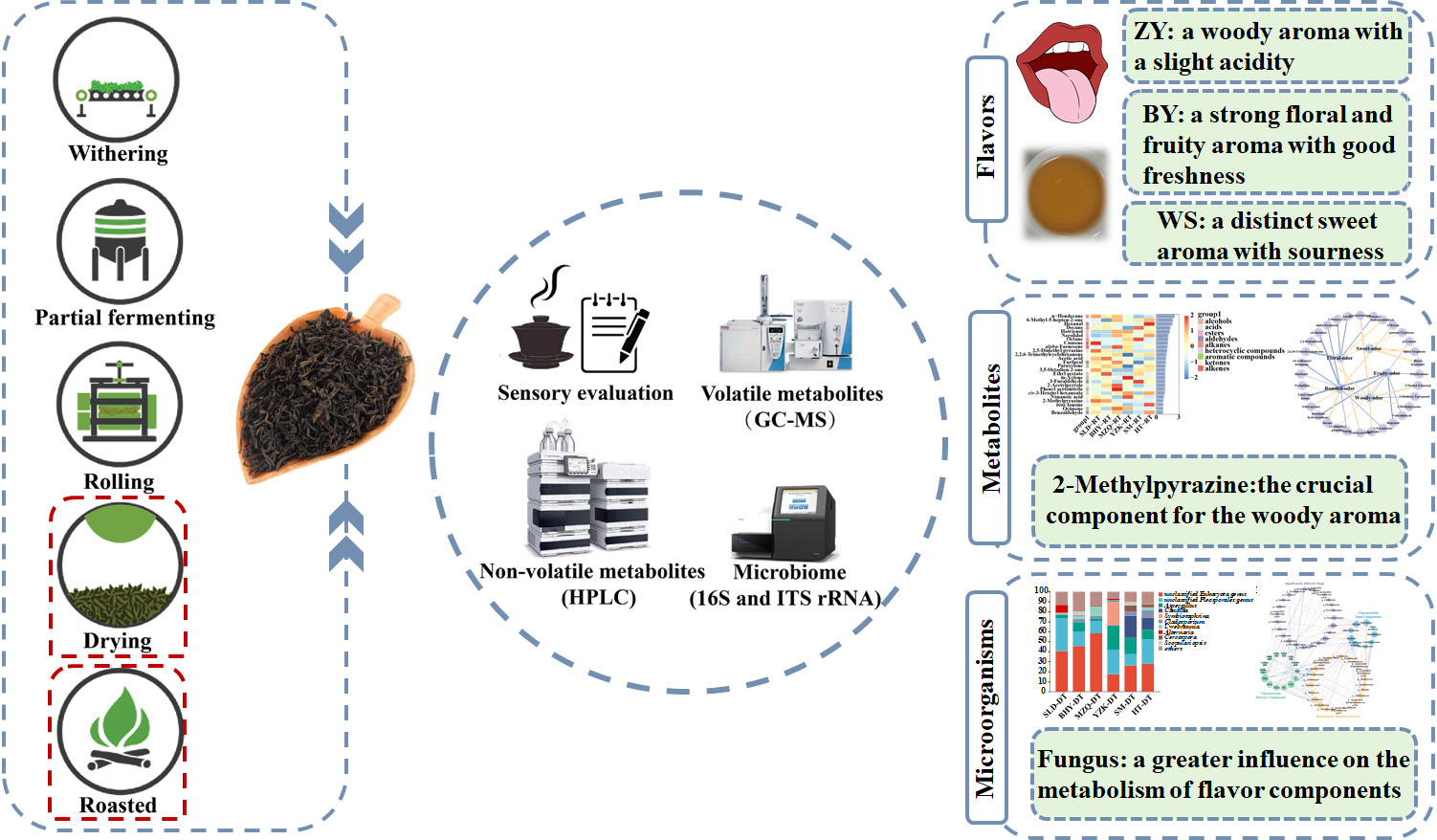 张娟教授团队针对不同产区武夷水仙“岩韵”的风味特征、茶叶本身的化学组分和菌群组成差异特征,以及三者之间相关的内在联系问题,基于感官品评采用多组学(代谢组学和微生物组学)联用的技术测定不同产区武夷水仙的风味、物质与微生物组成,进一步构建三者的关联网路。首先,通过感官品评,确定了水仙茶普遍具有花果香、顺滑、甘甜和醇厚的特征,但各产地水仙茶优势风味属性不同。结合代谢组学,解析了造成风味感官差异的原因:正岩水仙茶更具木质香、低酸度的特征,2-甲基吡嗪可能是促进木质香的重要代谢物质;半岩水仙茶的花果香更浓郁且鲜味尚佳,与α-法呢烯、羟基丙酮、γ-松油烯、茶氨酸(Thea)、表没食子儿茶素没食子酸酯(EGCG)和咖啡碱(CAF)的作用密切相关;外山水仙茶的甜香显著但重酸,受到己醛、β-紫罗兰酮、橙花叔醇和有机酸类等的显著影响。其次,针对水仙的半发酵属性,通过高通量测序解析了各产区水仙茶的菌群差异。结果表明,虽然菌属群落结构相似,但是相对丰度存在差异。将差异微生物与特征风味物质关联,得到Salinarimonas、Symbiotaphrina、Cladosporium、Aspergillus、Candida与不同特征风味物质相关的结果,并且表明真菌对于风味物质的影响更为显著。本研究为水仙茶的“岩韵”探究提供了部分依据,且给武夷岩茶的传统发酵工艺提供新思路,基于此,加速武夷岩茶的标准化、规模化产出,减少积压的低质茶库存,对于提升岩茶科技水平、扩大低质茶经济效益具有重要意义。