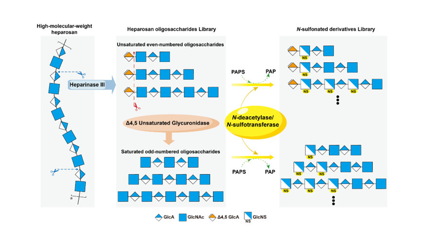肝素是一种高度磺酸化修饰的糖胺聚糖,通常从猪肠粘膜中提取,因其具有抗凝血和抗炎等多种生物活性而在临床治疗中广泛应用。低分子量肝素相比普通肝素具有更强的抗凝血活性和更少的副作用,但其生产仍需依赖动物源肝素作为原料进行降解,无法避免动物源肝素带来的异质污染风险。因此,低分子量肝素的酶促合成开始受到广泛关注。第一个也是最具挑战性的修饰反应由N-脱乙酰酶/N-磺基转移酶(NDST)催化,其催化产物N-磺酸化肝素前体是后续四种修饰酶的底物,对肝素和低分子量肝素的生物活性至关重要。作为肝素合成的中间物质,具有明确结构的N-磺酸化肝素前体不仅有助于深入研究中间产物的构效关系及生物活性,还有助于保证最终产物的结构均一性。因此,通过酶法合成N-磺酸化肝素前体寡聚糖并进一步解析NDST的识别与催化模式具有重要的研究意义和市场前景。
