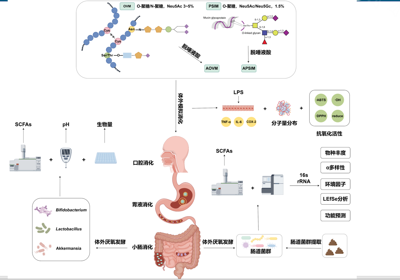 吴剑荣老师课题组前期发现富含Neu5Ac的食用燕窝(一种MUC5AC粘蛋白)可以在体外降低孕妇肠道菌群中致病菌如克雷伯氏菌属的丰度,并增加拟杆菌属等益生菌的丰度,而脱去末端唾液酸则失去益生效果。为了进一步探究不同构型唾液酸聚糖与肠道菌群之间的关系,该团队首次选用了两种天然膳食来源粘蛋白为研究对象。卵粘蛋白(OVM,含有MUC2/MUC6粘蛋白)和猪小肠粘蛋白(PSIM,结构MUC2粘蛋白)均为富含唾液酸的食源粘蛋白,但二者富含的唾液酸种类有所区别,其中OVM富含Neu5Ac,而PSIM中Neu5Gc的占比约45%。细胞实验结果表明,经过体外模拟消化的OVM未表现出细胞毒性,且具有比PSIM更良好的抗炎能力。同时OVM消化液能够在体外刺激老年个体粪便样本体外发酵的有机酸产量,且提高了有益细菌如乳酸菌和双歧杆菌的相对丰度,同时减少了致病菌如克雷伯氏菌的丰度。该研究验证了膳食粘蛋白所含唾液酸聚糖中,Neu5Ac相较于Neu5Gc更加良好的体外益生活性,能更好抑制有害菌生长。该研究可为老年人膳食平衡和肠道健康提供一定理论指导。