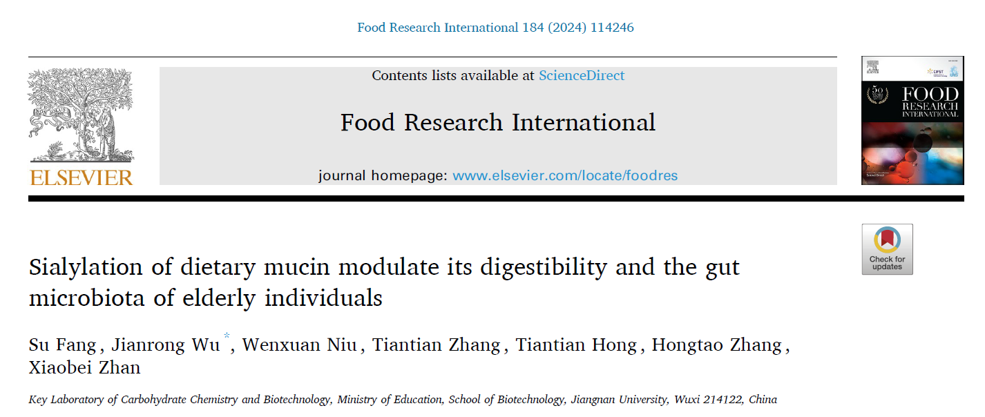 近期,我校beat365在线唯一官网高敏杰团队吴剑荣老师在不同构型唾液酸影响老人肠道菌群群落组成和结构方面研究取得重要进展,研究成果“Sialylation of dietary mucin modulate its digestibility and the gut microbiota of elderly individuals”正式发表于Food Research International (Q1, IF=8.1) (https://doi.org/10.1016/j.foodres.2024.114246)。