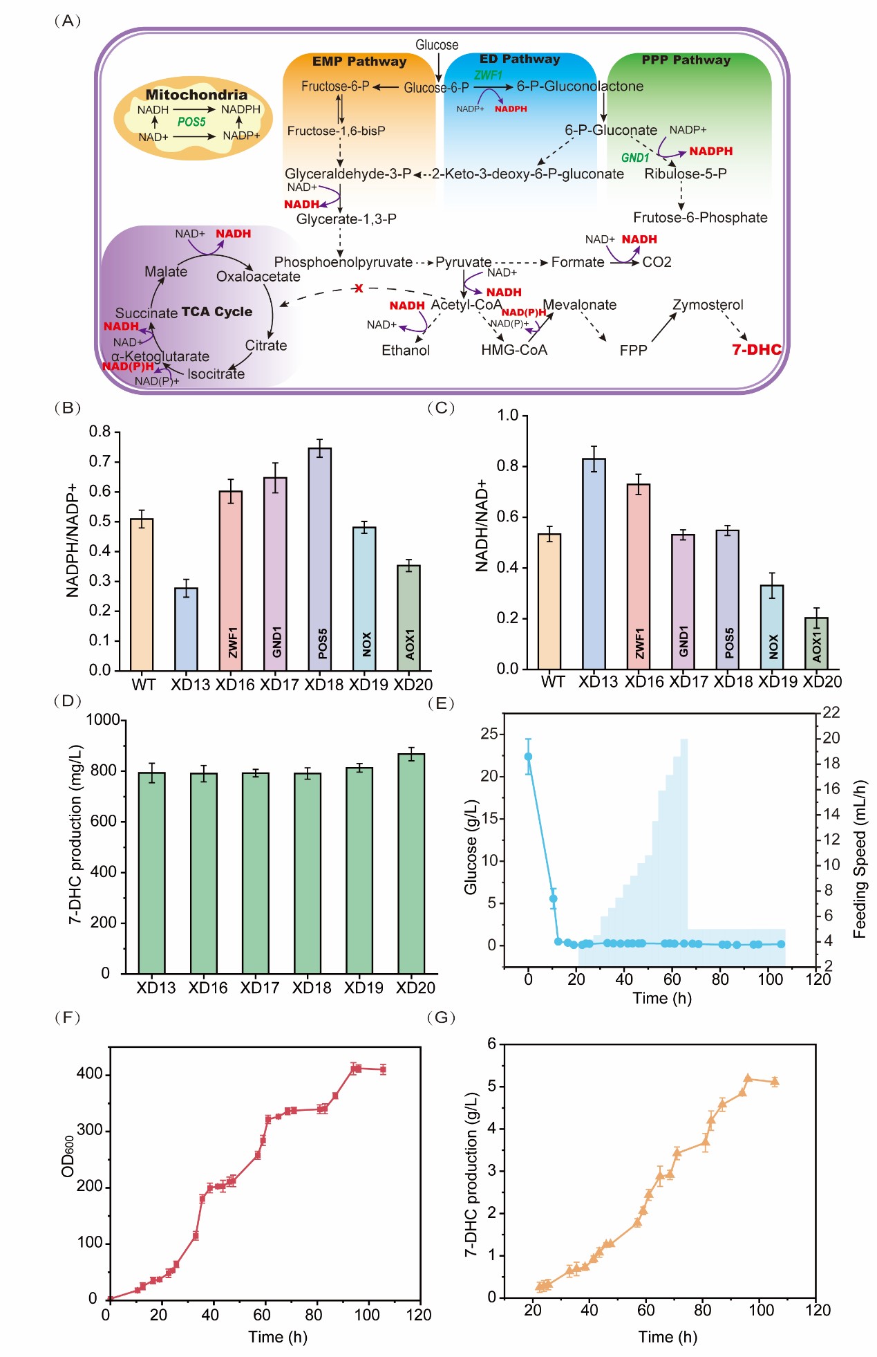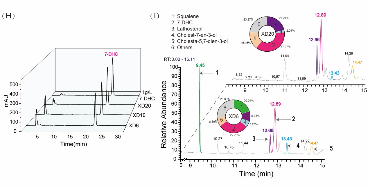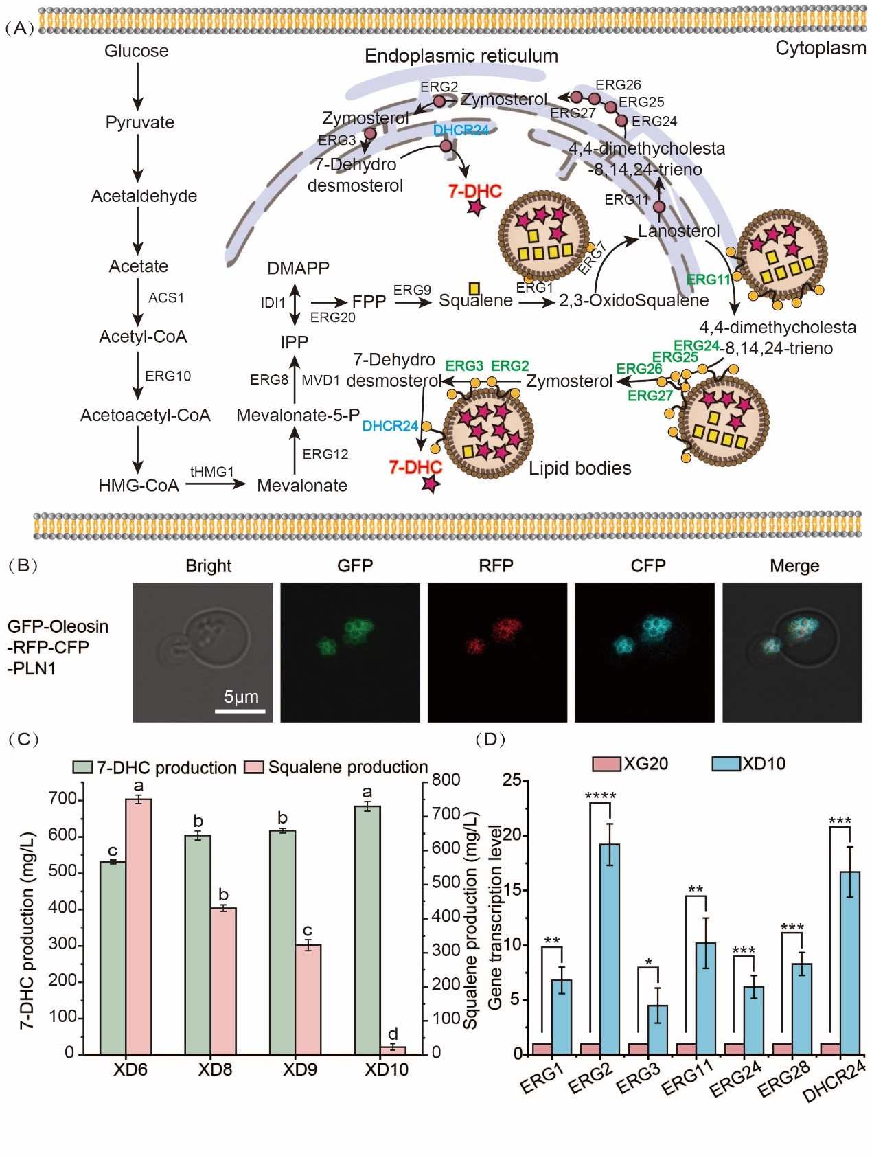 维生素D3(VD3)是一种维持人体健康所必需的类固醇化合物,广泛应用于医药、食品和饲料等行业。前体化合物7-脱氢胆固醇(7-DHC)经光转化后可以直接合成VD3。目前7-DHC的制备方法主要包括化学合成法和微生物发酵法,相较于化学合成法,微生物发酵法因具有环境友好、生产过程安全易控制等优势,受到研究者的广泛关注。但是,合成7-DHC的前体物质主要为固醇和萜类化合物,它们在胞内的大量累积易对细胞产生毒性,为避免或减弱这种毒害作用,细胞往往会将这些固醇和萜类化合物封存于某些具膜细胞器中。然而,这种封存会在空间上将前体物质与下游合成途径中的酶进行隔离,从而限制了目标产物的高效合成。