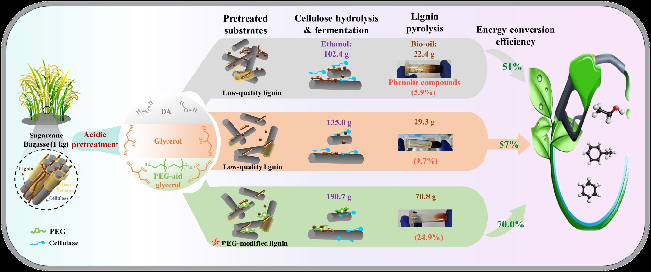针对以上问题,我们课题组尝试在酸催化甘油有机溶剂预处理过程中添加表面活性剂,以期通过原位修饰木质素而减缓木质素再缩合副反应。实验首先通过对比稀酸和酸催化甘油预处理而构建了表面活性剂PEG辅助酸催化甘油预处理体系。接着通过现代分析技术解析了表面活性剂辅助甘油有机溶剂预处理缓和木质素再缩合的机理:表面活性剂通过醚化接枝反应修饰木质素而改变了后者的理化性质,使其含有相对丰富的β-O-4连接键、较少的酚羟基并增强了木质素亲水性。这种修饰作用实现“一石二鸟”效果:一方面,减弱了残留木质素与纤维素酶之间的非生产性吸附,从而提升了底物可酶解性;另一方面,该双重修饰型木质素具有高反应活性,比如热解时高量多丰度浅颜色的芳烃化合物而减少生物炭生成。最后系统评估了整个过程能量盈余情况,发现此策略可产出8.9 MJ/kg的能量,总能量转化率高达70%以上。总之,本研究提出的木质素优先型“一石二鸟”预处理方法在农林纤维类生物质炼制方面具有显著优势。