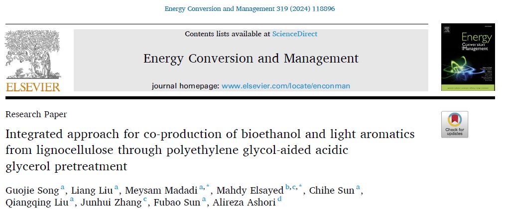 近期,我校beat365在线唯一官网生物资源与生物炼制研究团队在木质纤维素生物质联产生物乙醇和轻质芳烃化合物方面取得重要进展,研究成果“Integrated approach for co-production of bioethanol and light aromatics from lignocellulose through polyethylene glycol-aided acidic glycerol pretreatment”正式发表于Energy Conversion and Management(一区, Top, IF 9.9)。