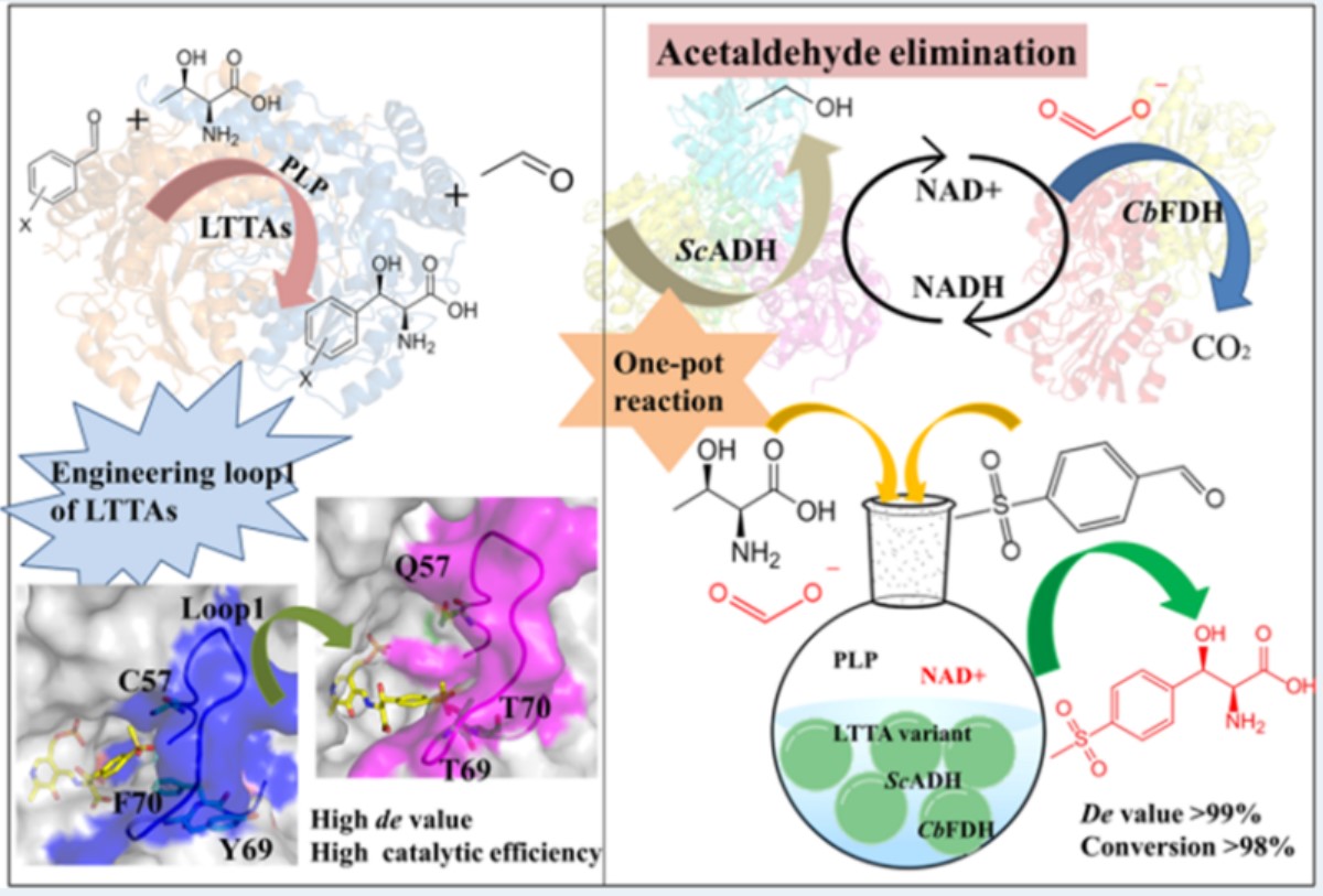 光学纯的非天然氨基酸是许多精细化学品、药品、农用化学品和重要重要组分。其中β-羟基-α氨基酸(βHAAs)是构成了多种天然化合物的核心结构,也是合成关键生物活性农药和药物如氯霉素、氟苯尼考、万古霉素、环香素a等的中间体。L -苏氨酸转醛缩酶(LTTA)是合成β-羟基-α氨基酸(βHAAs)有吸引力的生物催化剂,但其酶活低且Cβ对映选择性差阻碍了它的应用前景。本研究基于L-苏氨酸转醛酶的结构信息,半理性设计LTTA活性中心Loop环区域,获得了催化效率显著提升的有益突变体,基于分子动力学模拟与元动力学模拟掲示了活性中心Loop环调控L-苏氨酸转醛酶的催化机理。同时引入副产物乙醛消除系统,最终在1000L发酵罐条件下实现了氟苯尼考中间体L-syn-对甲磺酰基苯丝氨酸(L-syn-MTPS)的高效合成。主要研究内容如下: