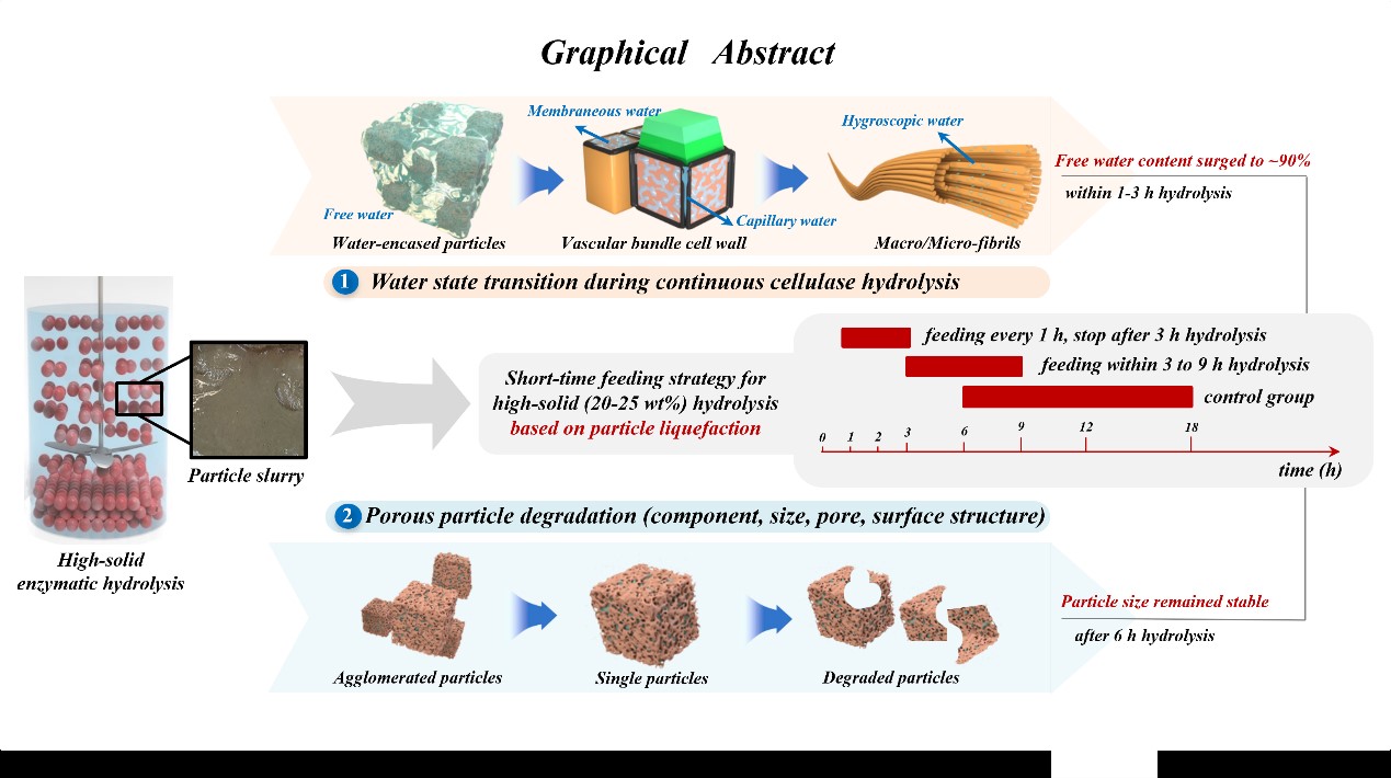 木质纤维素是自然界唯一的可再生碳源,其生物炼制过程包括预处理和酶解两个关键步骤。在酶解过程中,考虑到高糖浓度和低操作成本,木质纤维素生物质的浓醪酶解制糖是一种高效且经济可行的方法。通常情况下,浓醪酶解的固体负荷大于15 wt.%,浆液体系几乎不含自由水。从理论上讲,浓醪酶解是一个多相、多尺度的酶转化过程,其水解性能本质上依赖于生物质颗粒、水和纤维素酶之间的协同作用。因此,研究生物质的颗粒特性(如木质纤维素组分、粒径、孔隙率、孔隙结构)和水态分布规律(吸湿水、膜状水、毛管水、自由水)对预处理木质纤维素底物浓醪酶解过程的影响具有重要意义。