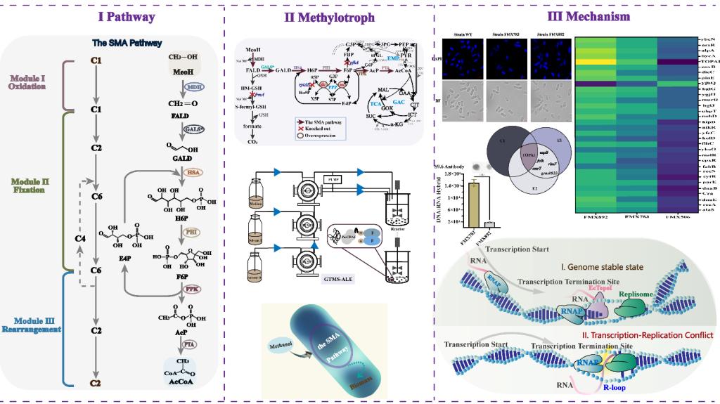 图1:人工甲基营养菌的构建以及生长新机制解析示意图