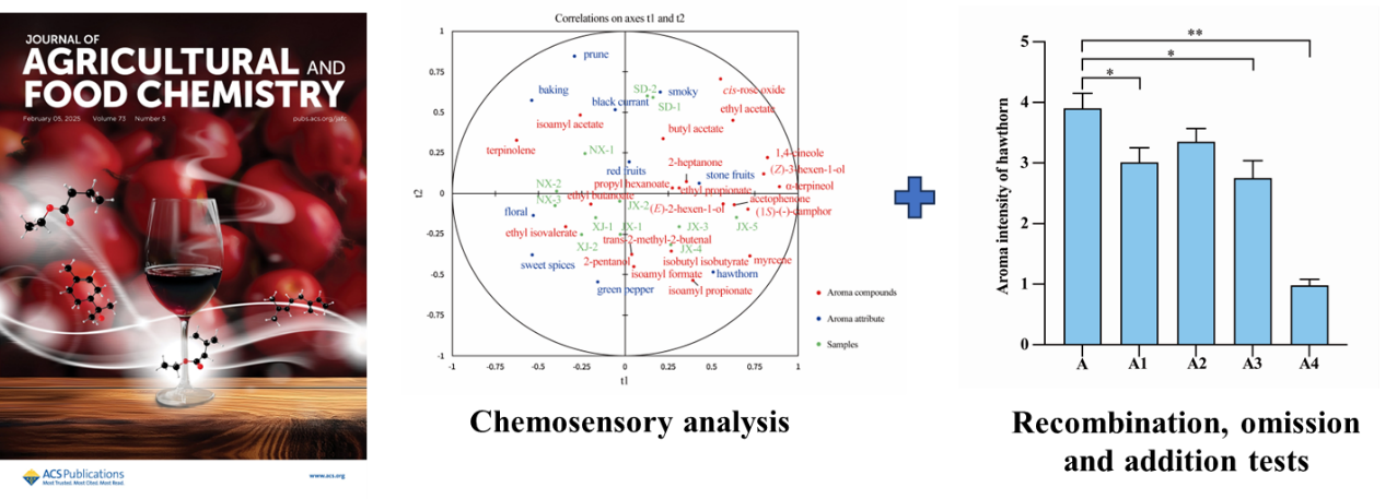 近日,我校生物工程学院徐岩教授团队唐柯副教授在葡萄酒山楂特征风味解析方面取得重要进展,相关研究成果“Characterization of odorants causing the hawthorn aroma in Cabernet Sauvignon wine by gas chromatography-olfactometry, quantitation, aroma recombination, omission and addition studies”以封面文章发表于Journal of Agricultural and Food Chemistry(一区, Top, IF 5.7)(https://pubs.acs.org/doi/10.1021/acs.jafc.4c09533)。