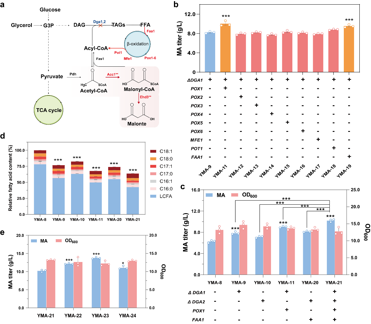 beat365在线唯一官网邓禹教授课题组选取耐酸性能力强、丙二酸前体丙二酰辅酶A高代谢通量的解脂耶氏酵母为底盘细胞,通过筛选丙二酸生物合成过程中的关键酶丙二酰辅酶 A 水解酶设计构建了基于丙二酰辅酶A途径合成丙二酸的工程菌株。首先,通过在解脂耶氏酵母中构建 3 种不同的合成途径评估了丙二酸合成能力,验证了来自酿酒酵母的丙二酰辅酶A水解酶Ehd3**途径效率最高。为进一步提升 MA 的产量,从解脂耶氏酵母和尖孢镰刀菌中鉴定出两种具有高催化活性的新型丙二酰辅酶 A 水解酶,其中表达尖孢镰刀菌丙二酰辅酶 A 水解酶FoEhd3**可使丙二酸产量提高至 6.3 g/L。随后,通过对工程菌株进行代谢改造,确保前体乙酰辅酶 A 和丙二酰辅酶A有充足的通量用于丙二酸的生产,在摇瓶培养中丙二酸产量达到 13.8 g/L。最后,通过优化发酵条件并在 5L 发酵罐中进行高密度发酵,以甘油为初始碳源,在初始培养基中甘油耗尽后,采用恒速进料策略,发酵156 h 时,丙二酸的最高产量达到 63.6 g/L,产率为 0.41 g/L/h。本研究为工程化解脂耶氏酵母生产丙二酸提供了一种绿色、高效的合成方法,为丙二酸的工业化生产提供了可能。