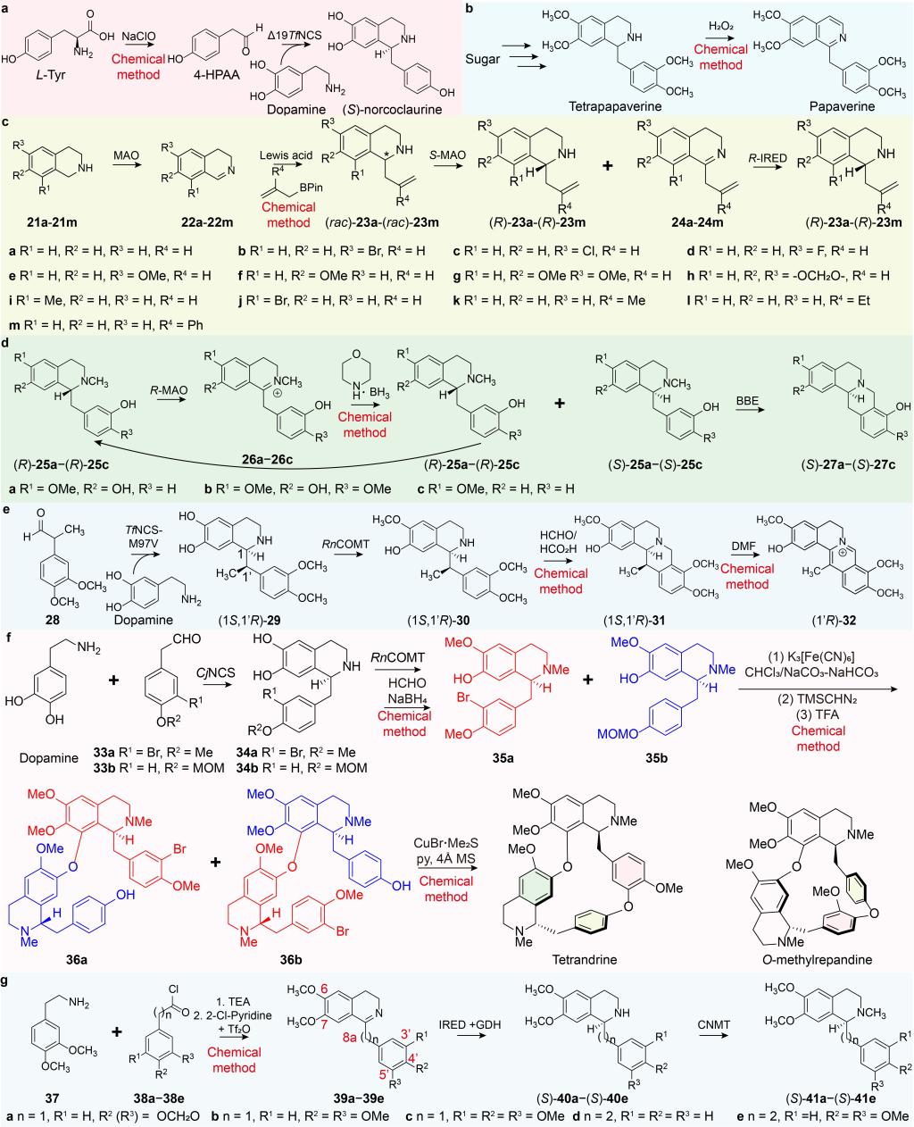 近年来,随着基因组学、转录组学和代谢组学技术的进步,研究人员解析了多个THIAs的天然合成途径,特别是秋水仙碱、加兰他敏和原吐根碱(图1),为此类化合物的微生物异源合成提供了坚实的基础。通过结合蛋白质工程、辅因子工程和全局优化工程等手段,成功在大肠杆菌和酿酒酵母中实现了多种THIAs的高效合成,如吗啡、诺司卡品和血根碱等。通过构建人工多酶级联反应,简化了天然产物的合成步骤,有效地提高了终产物产量(图2)。此外,化学酶级联反应也为THIAs的合成提供了新的思路,结合化学合成和酶催化的优势,实现了复杂分子的高效合成(图3)。尽管目前仍面临THIAs在微生物异源合成产量低等挑战,但通过新酶挖掘、辅因子工程、模块化调控和设计人工多酶级联反应等策略,未来有望实现THIAs的工业化生产。这项研究为THIAs的高效生物合成提供了新的思路,预示着未来通过微生物工厂大规模生产这些高价值化合物的可能性。