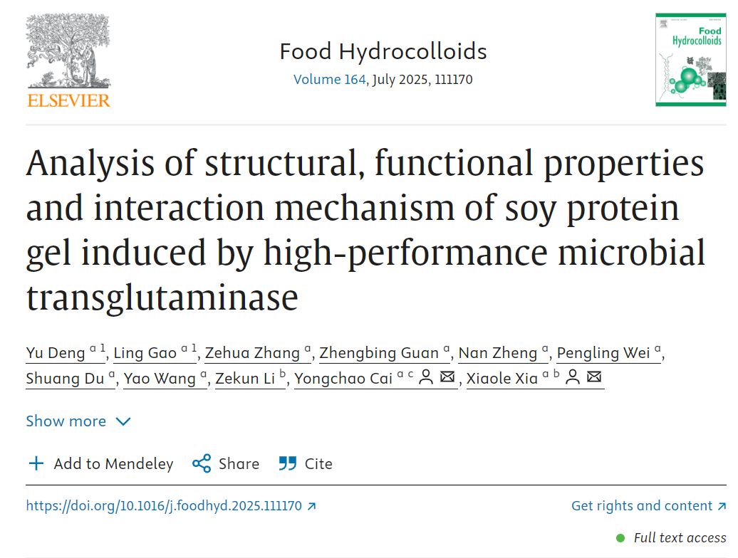 近期,我校beat365在线唯一官网夏小乐教授团队在微生物来源谷氨酰胺转氨酶(MTG)的改造与应用研究中取得新进展,研究结果“Analysis of structural, functional properties and interaction mechanism of soy protein gel induced by high-performance microbial transglutaminase”正式发表于Food Hydrocolloids(一区TOP期刊,IF=11.0) (https://doi.org/10.1016/j.foodhyd.2025.111170)。