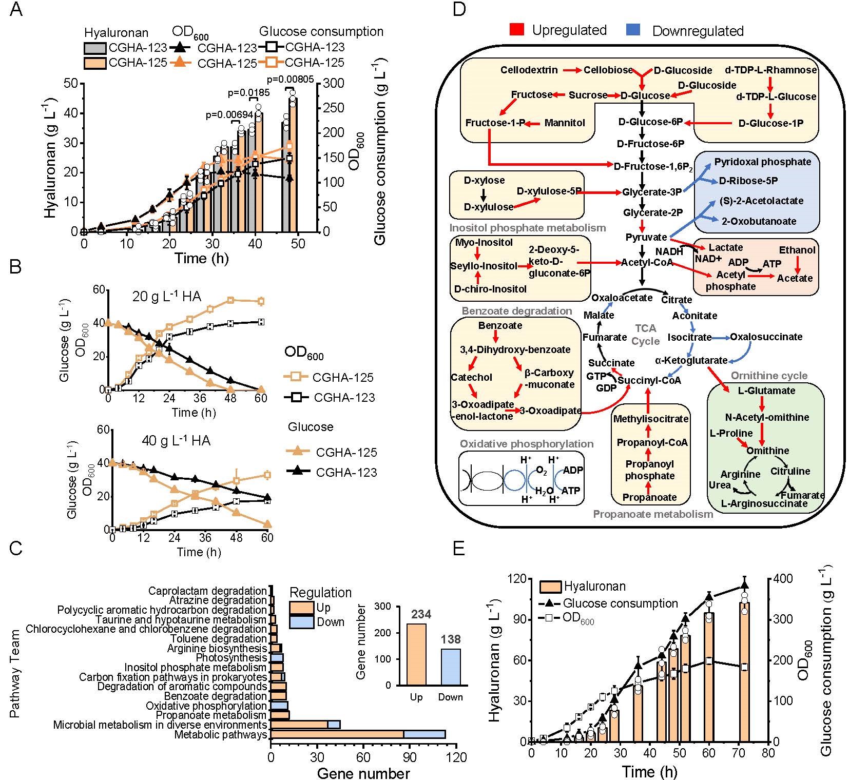 最后,在5 L发酵罐补料分批培养中,培养液黏度升高导致36 h后菌株代谢活性急剧下降。基于适应性驯化策略,通过高浓度HA环境中连续传代300次,筛选出耐受菌株。转录组学分析显示,能量代谢与胁迫响应通路显著上调,表明代谢通量再分配与NAD+再生增强是菌株耐受高黏度厌氧环境的关键。最终实现中高分子量HA产量45 g·L−1。为突破黏度限制,在补料培养16 h时添加水蛭源透明质酸酶,消除HA荚膜层以提升葡萄糖摄取效率,使低分子量HA产量达105 g·L−1。