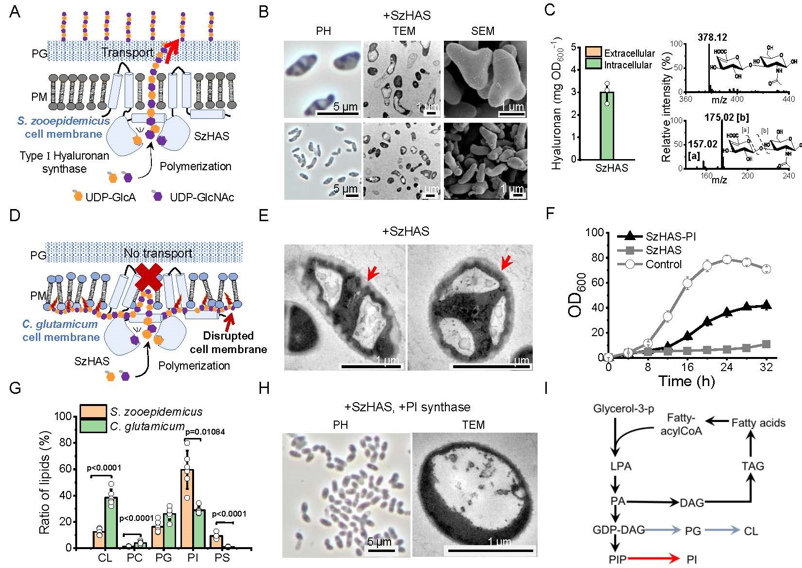 Ⅰ型HAS是一种多功能跨膜蛋白,其胞质结构域负责底物结合及HA聚合,跨膜通道调控HA链的延伸与转运。在谷氨酸棒状杆菌中外源引入兽疫链球菌来源HAS(SzHAS)后,发现SzHAS保留了HA聚合活性,但跨膜通道构象异常导致HA胞内积累,引发细胞形态畸变、膜损伤及生长代谢停滞。脂质组学分析表明,谷氨酸棒杆菌的磷脂酰肌醇(PI)含量显著低于兽疫链球菌。过表达PI合酶提升PI水平后,HA仍滞留胞内,但细胞生长部分恢复,形态及膜完整性显著改善。研究表明,SzHAS跨膜通道构象受膜脂质环境调控,其正确构象对HA生物合成和转运具有核心调控作用。