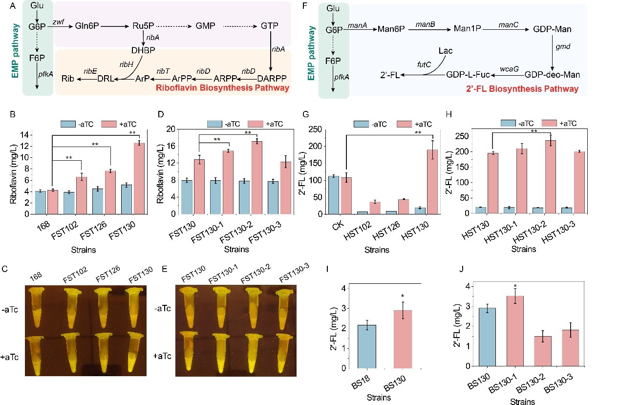 图6 基于CRISPRi/a系统的核黄素和2’-岩藻糖基乳糖代谢网络调控