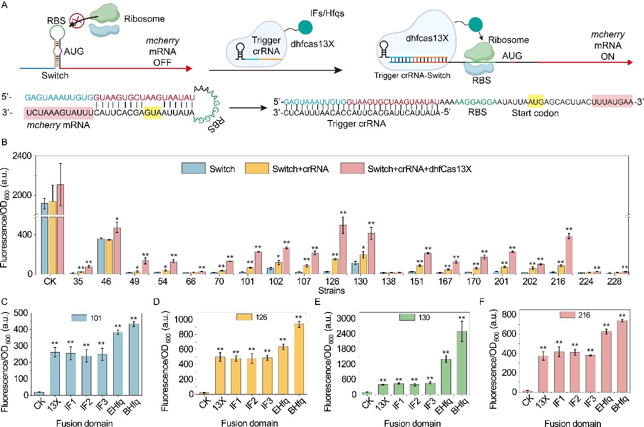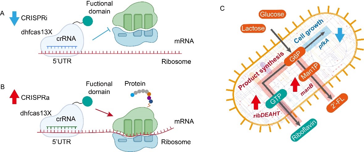 目前,国际上已开发了多种基因表达调控工具用于精细调节细胞工厂的代谢流,从而提高目标产物的合成效率。在众多代谢调控工具中,CRISPR-Cas系统因其能够同时激活和抑制基因的表达,且具有高精度、多功能性和可编程性强的优点,应用最为广泛。其中研究最多的为Cas9和Cas12a系统,然而,它们只能在转录水平上调节基因表达。与转录调控相比,翻译调控响应速率更快,并可独立调控细菌多顺反子中各个基因的表达。Cas13系统是一类靶向RNA,能够在翻译水平调控基因表达的CRISPR-Cas13系统。然而,基于Cas13系统所开发的表达调控工具仍然较少,且存在调控效果较差的问题。