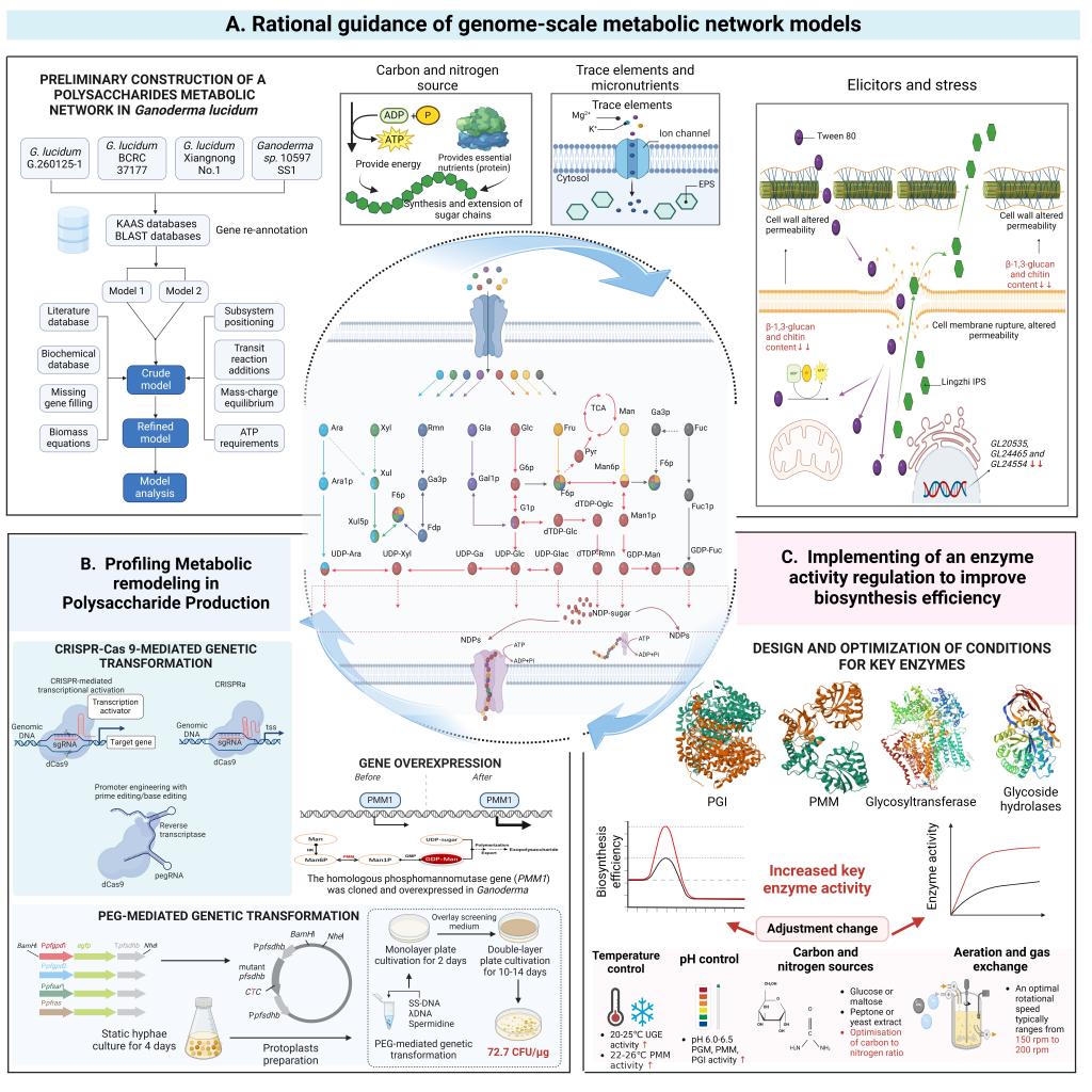 食药用真菌多糖是一类结构复杂、具有多种生物活性的天然高分子,广泛应用于免疫调节、糖脂代谢干预及肠道菌群重塑等健康领域。本文从“复杂结构构建机制、多糖合成机制、精准调控策略”三个维度,系统总结了食药用真菌多糖合成调控的最新研究进展与关键技术。
