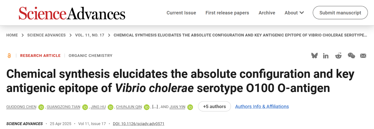 近期,beat365在线唯一官网、糖化学与生物技术教育部重点实验室尹健教授团队在致病菌糖链抗原的全合成及抗原性研究方面取得新进展,研究成果“Chemical Synthesis Elucidates the Absolute Configuration and Key Antigenic Epitope of Vibrio cholerae Serotype O100 O-Antigen”发表于Science Advances(https://doi.org/10.1126/sciadv.adv0571)。