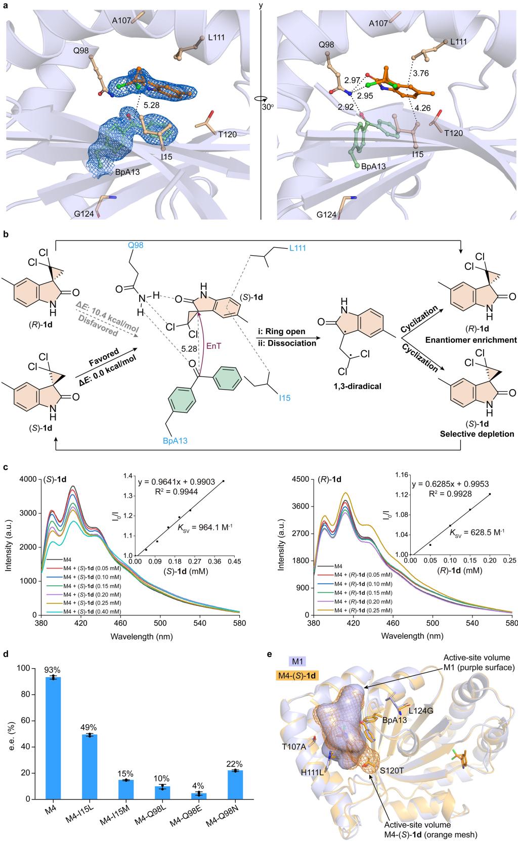 最后,对M4和M4-(S)-1d的晶体结构及光学实验分析探究反应机制。首先M4能精确识别底物对映体(M4与(S)-1d的结合亲和力(Ksv)显著高于(S)-1d),而底物和BpA与周围氨基酸的多重相互作用使底物定位到距离反应活性位点5.28 Å的位置。随后实现BpA与底物的高效三重态能量转移(量子产率为0.69)。接着,触发(S)-1d开环形成双自由基中间体,该中间体与M4解离后自发环化生成外消旋混合物,其中(S)-对映体重新进入催化循环而(R)-对映体选择性积累,最终实现(R)-对映体的高效富集(图4)。综上所述,通过基因密码扩展技术将CTB10蛋白骨架改造为人工光酶,经定向进化优化后成功实现环丙烷的高效去消旋化,其优异的对映选择性和底物普适性超越了化学光催化方法。晶体结构解析和光学实验揭示了催化机制,证明蛋白质骨架工程化可拓展生物催化的反应范围,为开发新型人工酶提供了通用平台。