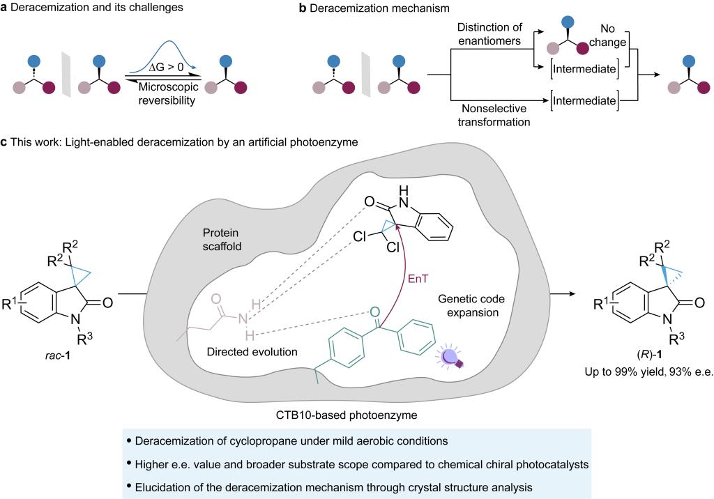 通过设计具有非天然催化活性的酶,为突破传统生物催化的反应限制提供了新策略。该研究基于基因密码子拓展技术成功的将新型蛋白骨架CTB10设计为人工光酶,该酶能够高效催化传统生物催化体系难以实现的热力学不利的环丙烷去消旋化反应。经定向进化后,CTB10光酶展现出广谱的底物适用性和优异的对映选择性(图1)。此外,CTB10光酶-底物复合物的晶体结构清晰地揭示了其手性催化空腔的构效关系,阐明了高效、选择性光驱动去消旋化的结构基础,以上研究为开发具有挑战性的生物催化去消旋化体系提供了新思路。