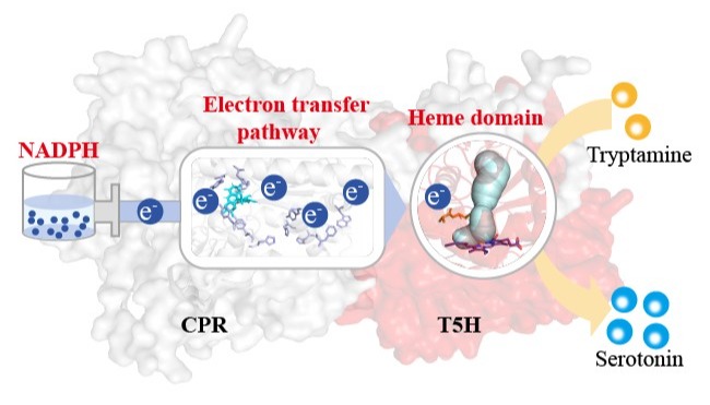 该研究团队以催化血清素合成的关键酶色胺-5-羟化酶(T5H,一种P450酶)和P450还原酶(CPR)为模型系统,开发了一种系统进化工程方法来提高双组分P450催化系统中的电子转移通量。基于定向进化和理性设计,首先通过重新设计CPR的电子转移途径来提高电子转移速率;然后,通过进化T5H的血红素结构域来提高电子接收速率;最后,通过微调NADPH合成来扩大电子供应。基于以上策略,最优突变体中T5H的催化活性(Kcat/KM)是野生型的36.62倍,工程菌株大肠杆菌S11可在7.5升生物反应器中产生15.42 g/L血清素。该结果为提高复杂P450催化系统中的电子转移通量和实现高效化学生物合成提供了新的策略。