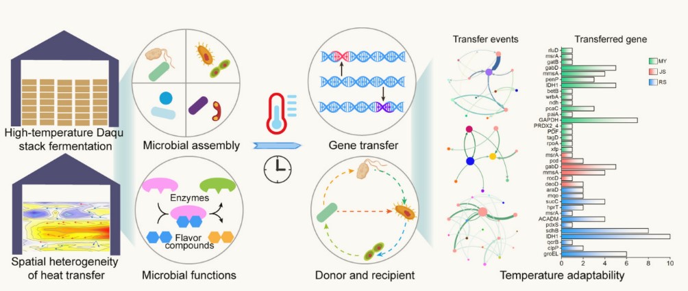 基于酱香型白酒核心产区贵州省赤水河流域的不同HTD样本,该研究团队揭示了HTD发酵中温度适应性塑造微生物结构和功能的机制。首先通过化学计量学分析和宏基因组测序阐明了风味特征的差异和共同点以及不同HTD的微生物组装和功能特性;然后通过微生物间代谢网络确定了核心微生物在高温胁迫下对底物降解和特征风味产生的贡献;最后采用MetaCHIP分析了高温驯化微生物群落和相关代谢基因的适应性转移,结果表明温度适应性促进了Bacillaceae家族内的水平基因转移以增强种群对温度的抵抗能力,并优化风味代谢通路。研究成果为通过定向微生物驯化提升固态发酵强度和效率提供了理论基础,对传统发酵食品工艺的智能化升级提供了重要指导。