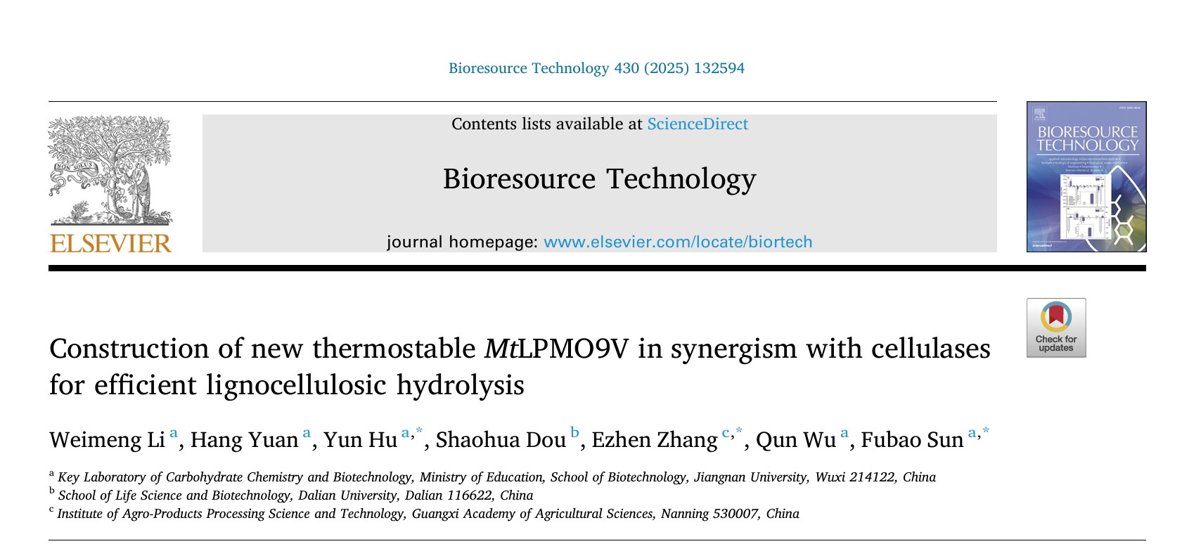 近期,我校beat365在线唯一官网生物资源与生物炼制孙付保教授团队通过对AA9家族LPMO酶进行挖掘与改造,在提升纤维素水解效率方面取得重要进展,研究成果“Construction of new thermostable MtLPMO9V in synergism with cellulases for efficient lignocellulosic hydrolysis”正式发表于Bioresource Technology(一区, Top, IF 9.7)。