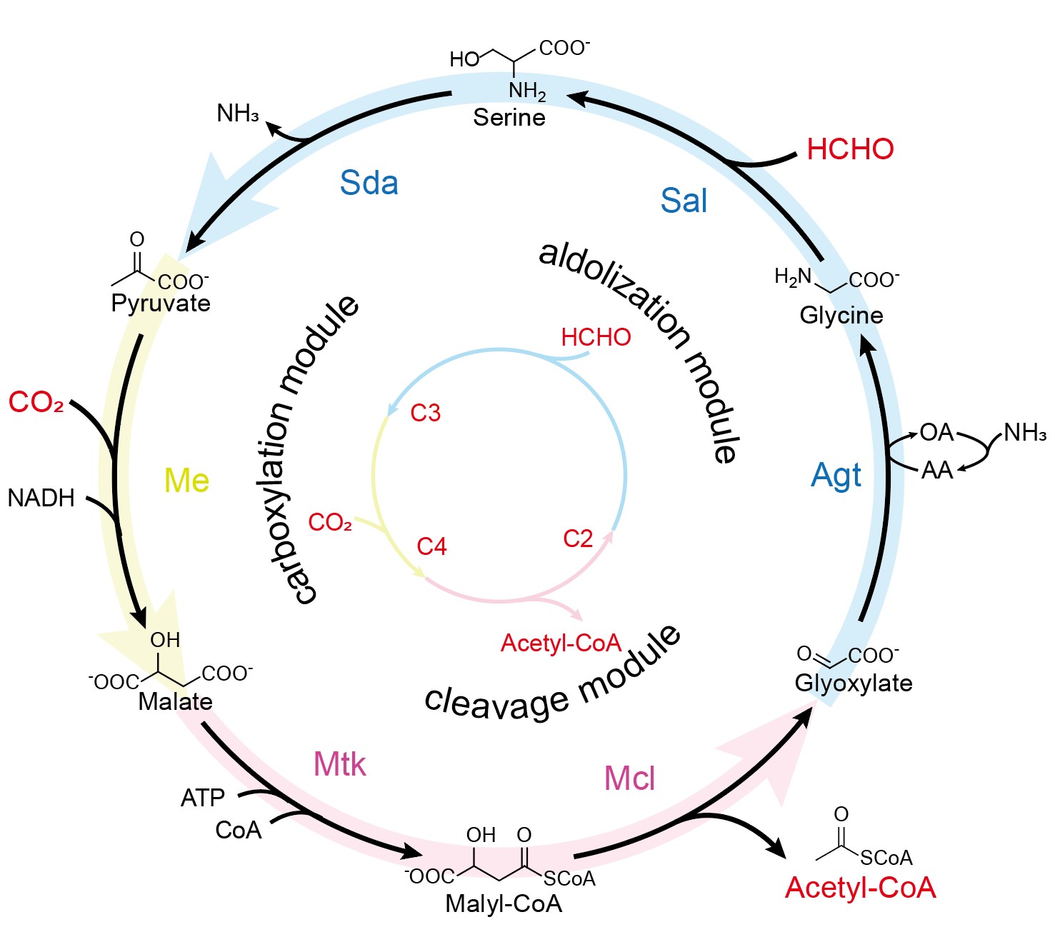 陈修来教授团队针对当前不同C1化合物共利用效率较低、难以充分发挥其应用潜力的问题,设计构建了一种新型的C1固定途径——丝氨酸醛缩酶/苹果酸酶(SM)循环。首先,通过编程设计二氧化碳固定羧化反应、甲醛同化醛缩反应及生成乙酰辅酶A的裂解反应,结合代谢逆合成分析设计了SM循环,并计算其吉布斯自由能值及最大最小驱动力(MDF),确认SM循环热力学的可行性。接着,通过招募筛选路径酶,实现SM循环的模块化构建,并整合三个模块实现一锅法从CO2和甲醛合成乙酰辅酶A;通过关键酶的工程改造和反应体系的调控优化,最终得到SM循环3.0版本,其C1利用速率达到30.2 nmol/min/mg蛋白。随后,采用“即插即用”的策略对该循环进行编程,通过引入不同的碳链延伸模块,将SM循环的产物乙酰辅酶A转化为多种C3化合物(如丙酮酸、3-羟基丙酸和丙酰辅酶A)和C4化合物(如琥珀酸、富马酸和琥珀酰辅酶A),实现了从CO2和甲醛合成多样化的C3和C4化合物。最后,在5 L发酵罐中验证了SM循环的体内应用潜力,其合成丙酮酸和琥珀酸的C1利用速率分别达到34.5 mg/gDCW/h和35.8 mg/gDCW/h,超过了微藻和蓝细菌的利用效率。综上所述,本文设计并构建了一种全新的固碳路径SM循环,为碳负生物制造提供了高效、灵活的平台。