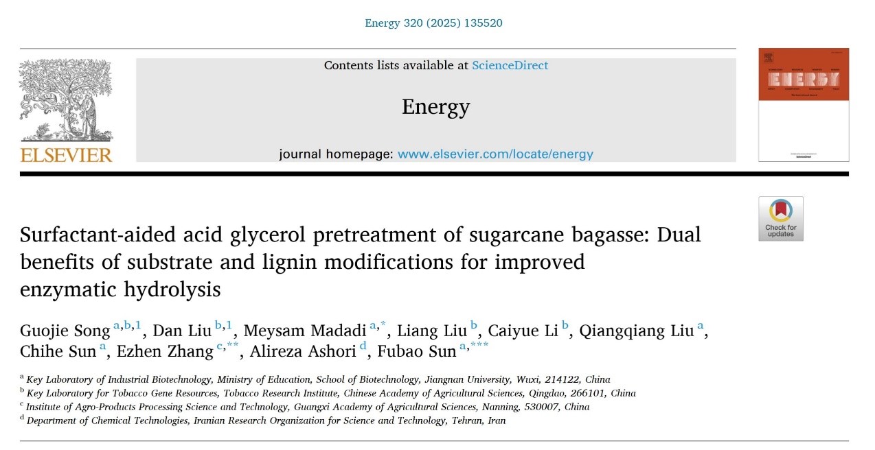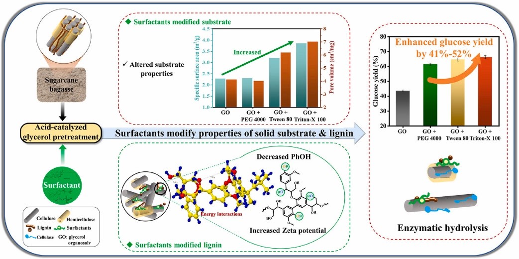近期,我校beat365在线唯一官网孙付保教授团队在研究先进预处理方法促进纤维质原料水解制糖方面取得重要进展,研究成果“Surfactant-aided acid glycerol pretreatment of sugarcane bagasse: Dual benefits of substrate and lignin modifications for improved enzymatic hydrolysis”正式发表于Energy (一区, Top, IF=9.4)。