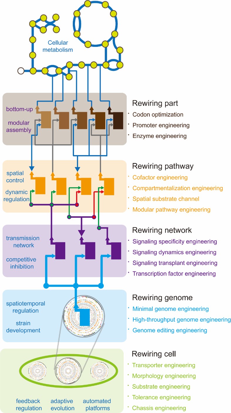 代谢工程旨在通过改造微生物的代谢途径,实现物质转化过程的高效与可控,是生物制造和绿色化学的重要支撑技术。随着合成生物学、系统生物学和计算设计等领域的协同发展,代谢工程正逐步形成多层次、可编程、可预测的研究体系。该综述从“层级结构—系统协调—智能优化”的角度,对代谢工程的分层调控体系进行了系统梳理,涵盖从酶部件到细胞整体的五个层次:部件层、通路层、网络层、基因组层和细胞层。